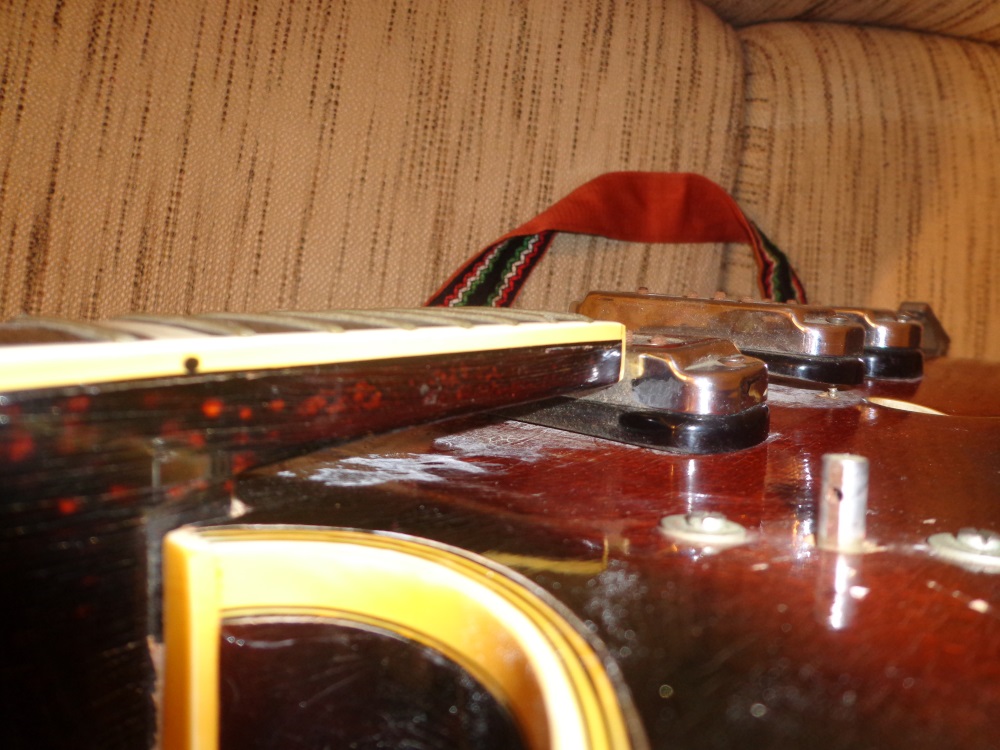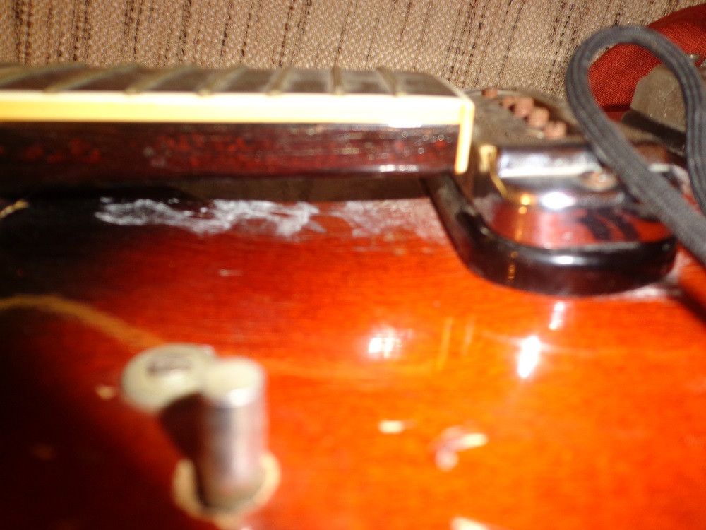 To rzeczywiłcie jest deformacja wtórna, a mogła powstaę na skutek nacisku tych pokazanych wczełniej na zdjęciach "podpórek", gdy komuł się poluzował gryf i nie umiał go dokręcię.
