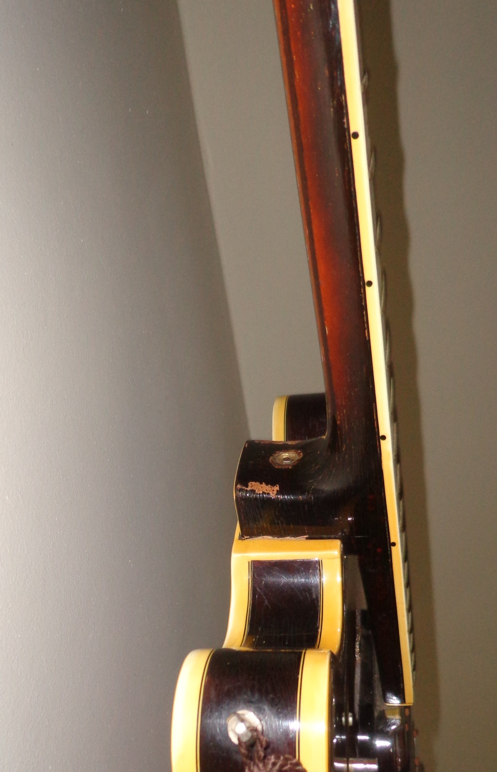 Może miała luęšłne mocowanie gryfu i ktoł wstawił takę podpórkę, a ona zniszczyła płytę. Na zdjęciu od czoła widaę nawet chyba odklejona płytę wierzchnię.