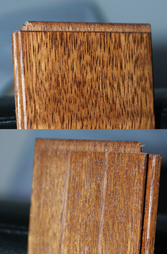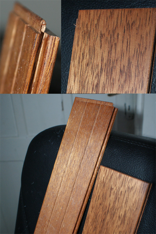 I tak zostałem posiadaczem deseczek (zdjęcia poniżej). Do zdjęcia wybrałem pierwsze lepsze dłuższe z paczki. Wymiary to ok. dł: 650-750mm, szerokołę ok. 62 mm, grubołę 8mm. Wymiary podałem na oko PO UWZGLęDNIENIU odpadu (po odcięciu tych frezów, czy jak to się nazywa, któe służę do łęczenia parkietu).