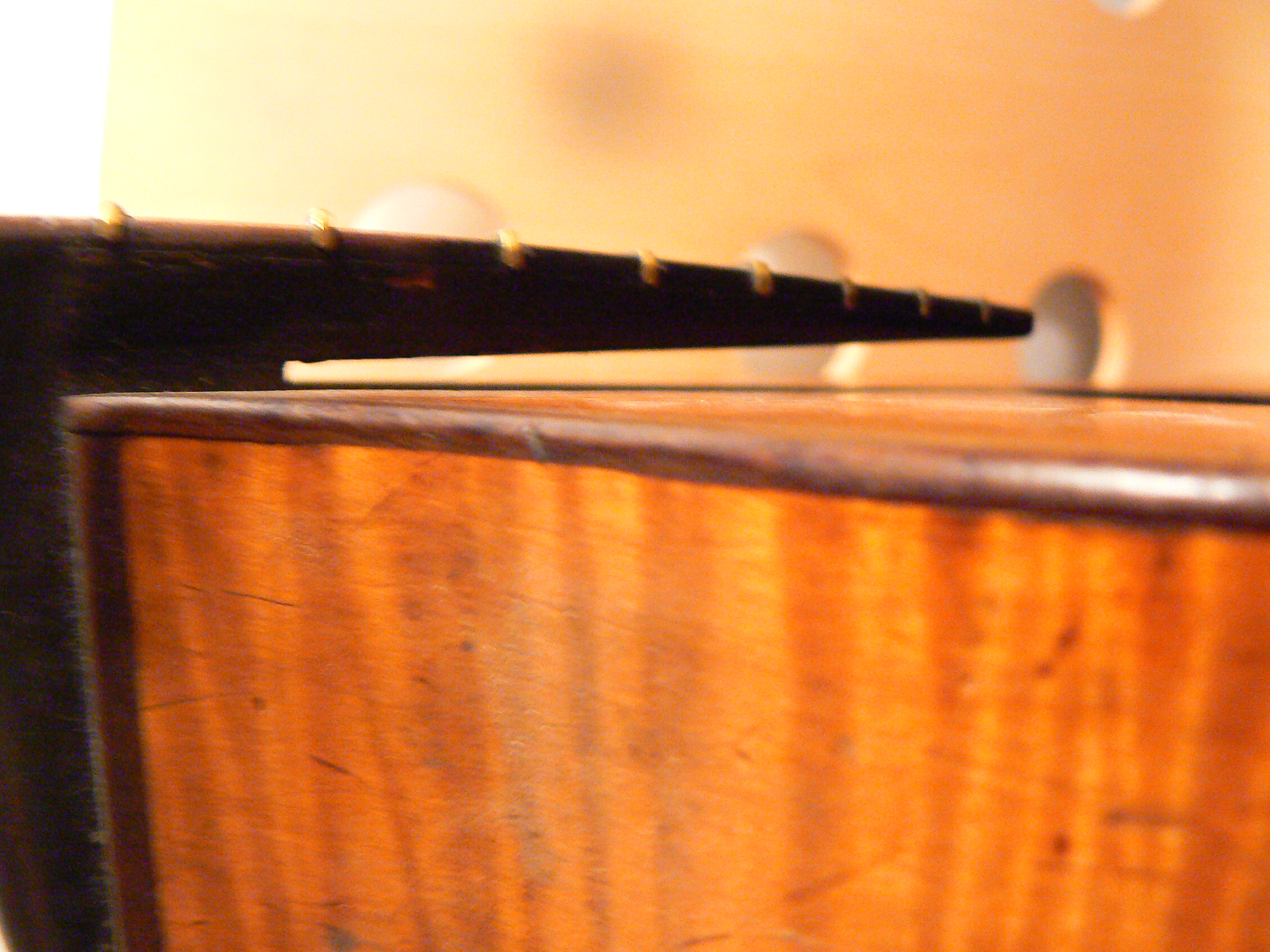Zastanawia mnie w niej kilka rzeczy. Gryf nie jest wklejony, tylko przymocowany jakęł dziwnę łrubę, nie wiem czy tak miało byę od poczętku, czy ktoł to zrobił póęšłniej. Tylna płyta niestety pęknięta...zupełnie nie wiem jak się do niej zabraę, bo drewno trochę się odkształciło i nawet przy próbie klejenia nie zejdzie się idealnie. Może jest na to jakał metoda?