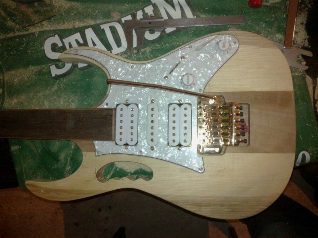 ładnie wykonana, ale niekonsekwentnie. Przepraszam, może będę nieprzyjemny, ale takiego JEMa chyba nikt od Ciebie nie kupi (tym bardziej fan Ibanezów), bynajmniej nie za takie pieniędze, jakie pewnie był chciał. Osobiłcie jestem przeciwnikiem budowy kopii znanych instrumentów posługujęc się logo firmy pierwowzoru. Nie dołę, że to "zżyna" z logo Ibaneza, czyli jednym słowem podróbka, to budowa zdecydowanie inna niż pierwowzoru. Szkoda, że nie wiadomo jakie przetworniki. Przepraszam, ale szkoda mi tej gitary z powodu tego logo i ewidentnego podszywania się pod znany model, skoro planujesz jej sprzedaż.