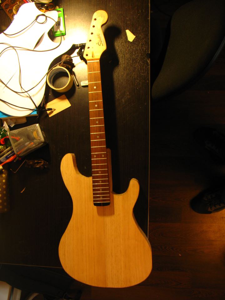 Nie ustrzegłem się błędów żółtodzioba: gryf prostowany w osi kawałkami drewna przy przykręcaniu (ęšłle wyfrezowana kieszeł i otwory jakby trochę nie tam gdzie byę powinny), binding - uwaga! - ze szpachli do drewna (idiotyzm, ale co zrobię), odrobinę nierówno nabite tuleje do strun, krzywe frezowanie zagłębieł na główki potencjometrów. Porażkę po całołci było przyklejanie forniru z hebanu szarego, który niedoskonale przykleił się do wyprofilowania pod przedramię, przez co gitara pozostała goła - lub jak kto woli, ubrana w jesion. Reszta do przełknięcia ;)