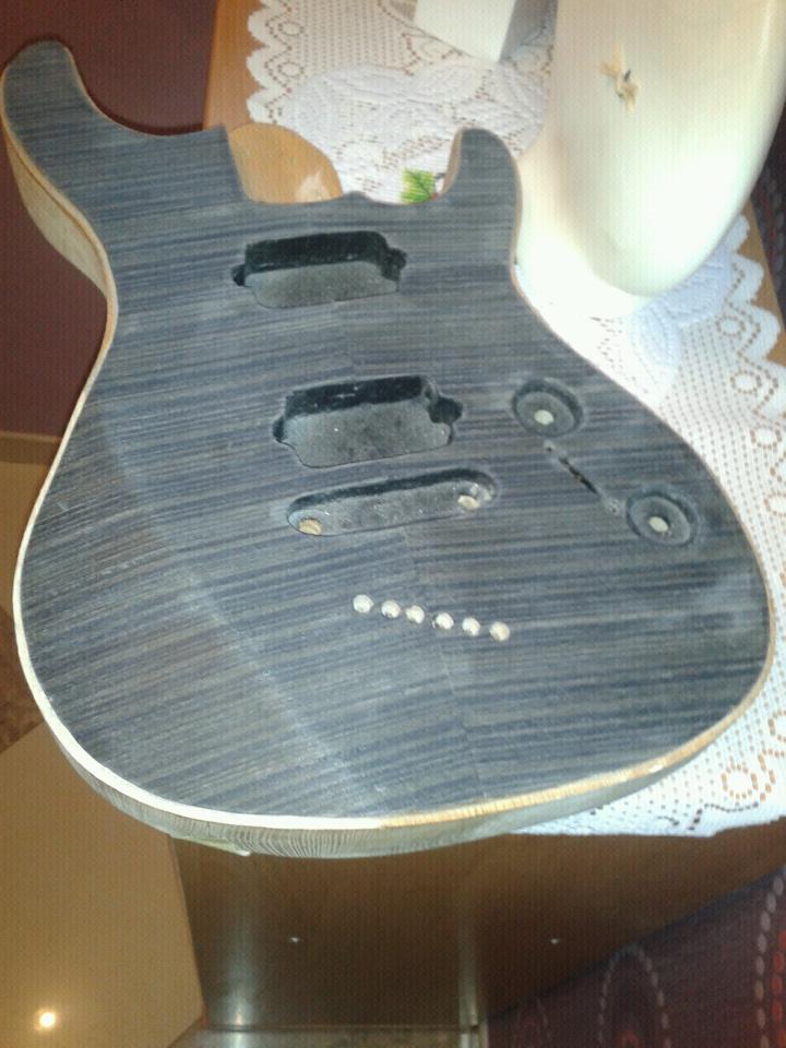 Chciałem pokazaę Wam swoje pierwsze wiosło, robione bez doświadczenia, bazujac tylko na tym, co udało mi się wykminię posiadajęc pewne elementy już kupione (gryf, mostek, pickupy) i oględajęc bardzo skrzętnie swoję własnę gitarę (Ibanez RG470).