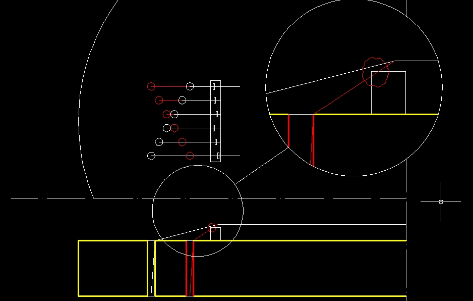 Rzuęcie proszę okiem na to, co narysowałem. W widoku z góry widaę na biało narysowane otwory, jakie przyjęłem, a na czerwono - ustawione zgodnie z sugestię kolegi Vintage. Siodełko struny e jest bliższe centrum gitary, niż struny E. Gdybym zrobił odwrotny układ od obecnego, zachodziłoby niebezpieczełstwo, że struna e opierałaby się dodatkowo o rant mostka (przekrój na dole, wersja czerwona + powiększony detal w okręgu). Gdy projektowałem gitarę, taka idea mi przyłwiecała. Nie będę ukrywał, że wiele obejrzanych Mayonesów Regiusów również zasugerowało dłuższę "resztkę" dla struny E. No i chyba jest to estetyczniejsze.