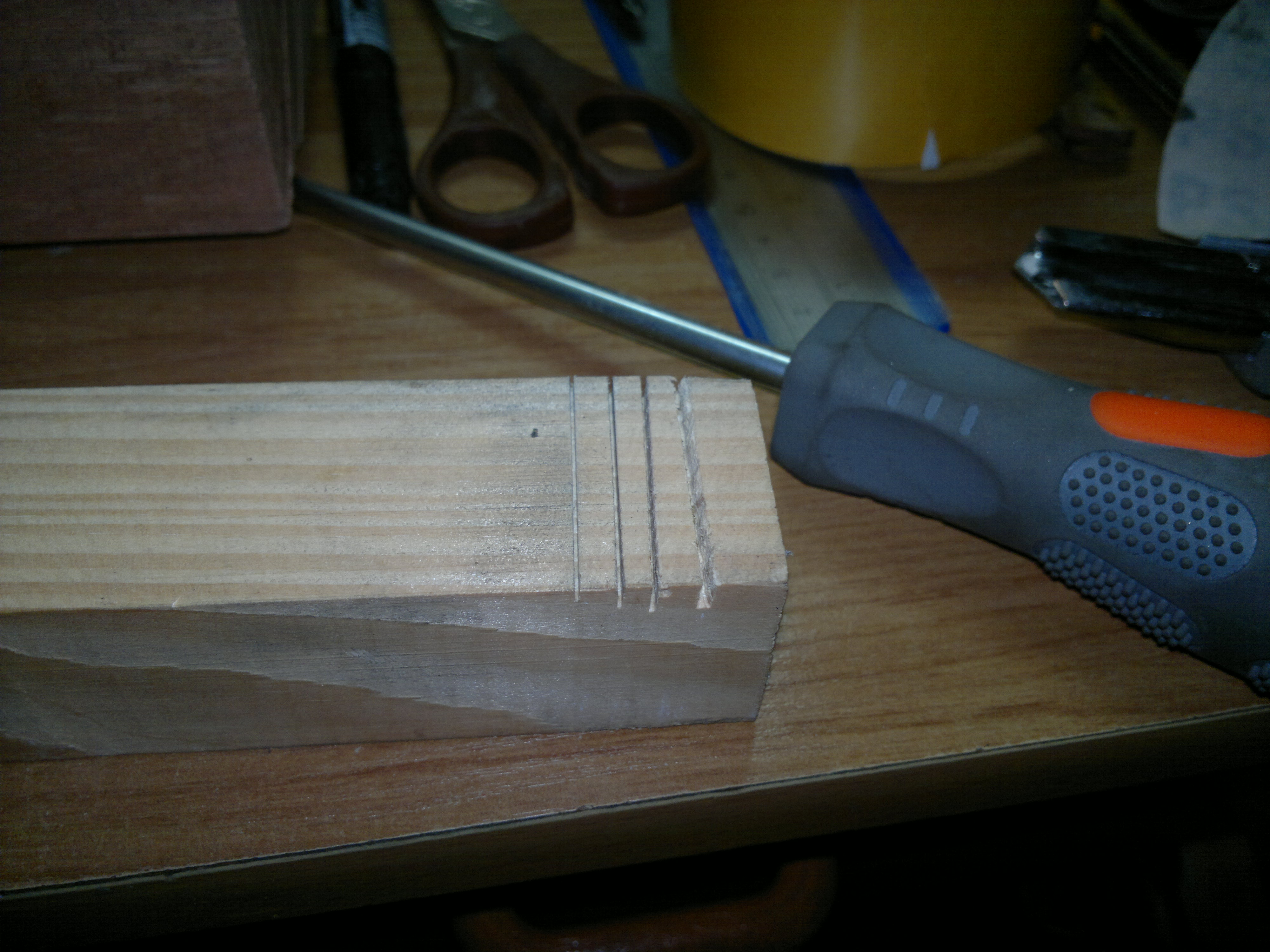 3. przymocowałem piłę do płaskiej powierzchni łrubami stolarskimi przez drewniany klocek, który przy okazji był prowadnicę.