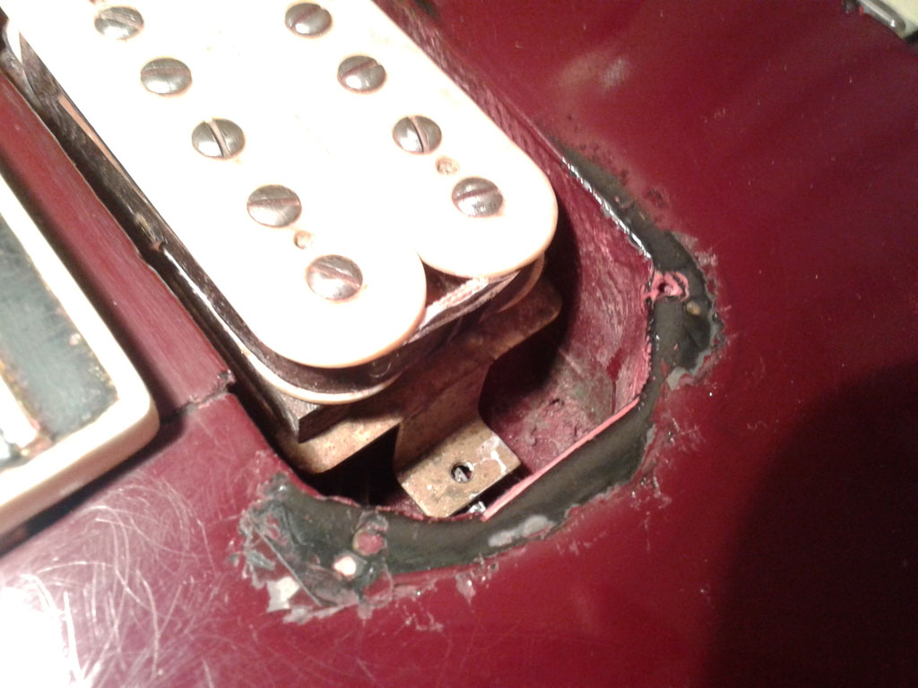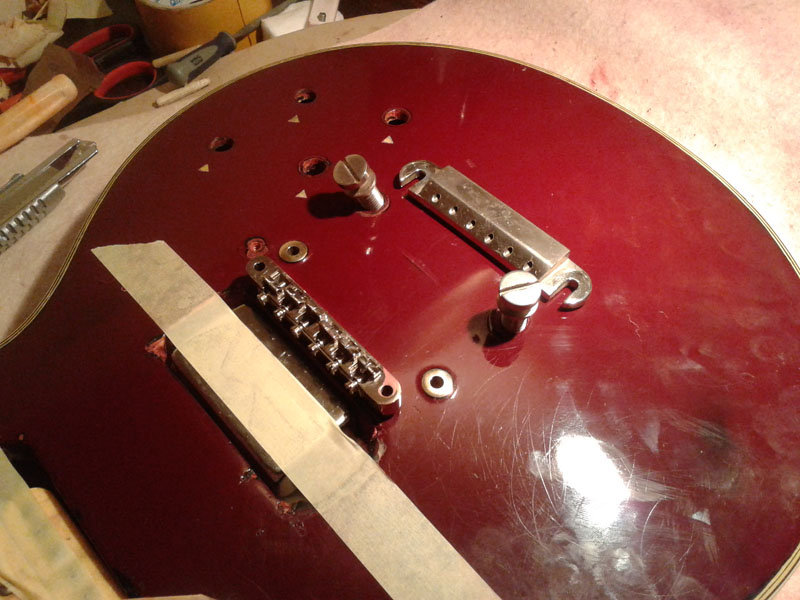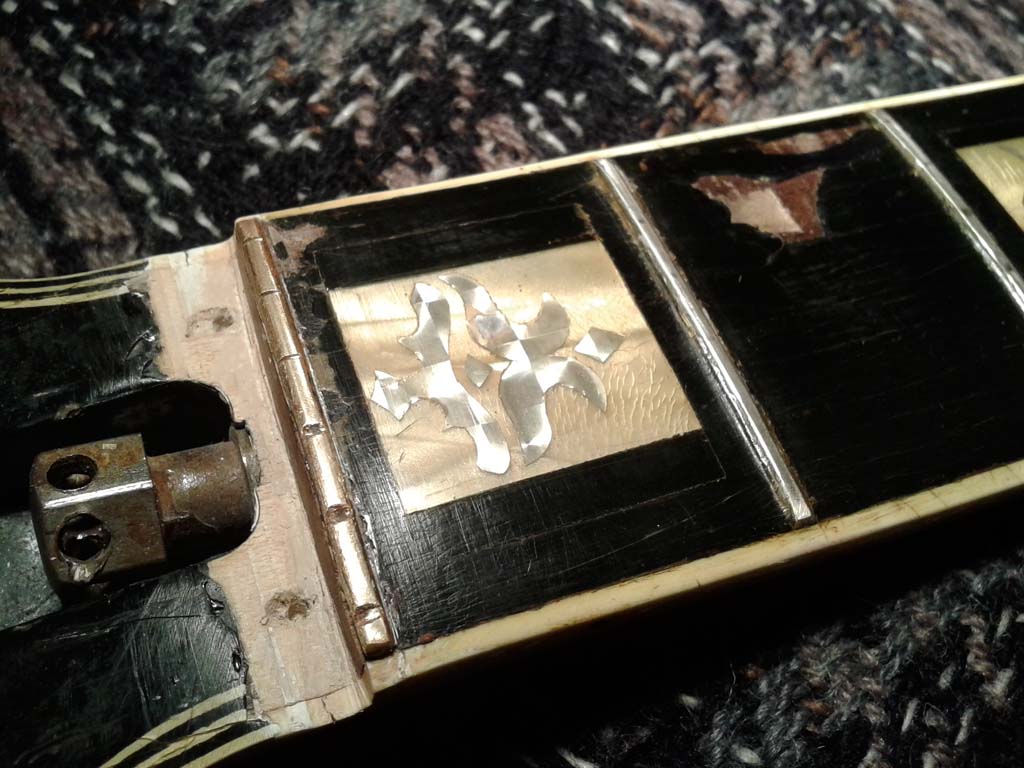 Niepokojęca wyględa gryf. Jest podejrzanie przykręcony, a dziury zaszpachlowane. Do szlifowania powinienem go odkręcię w sumie, ale się boję go ruszaę. Chyba zostawię i potraktuję jak wklejony.