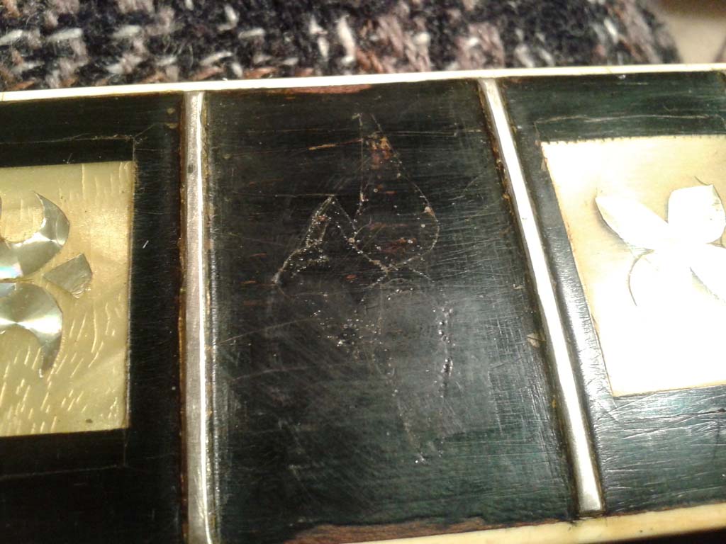 Druga sprawa to ten dziadowski lakier na podstrunnicy. Nie chcę ruszaę progów. Na razie nie ma kasy na przeprogowanie, więc go nie zeszlifuję. Mógłbym spróbowaę zdrapaę, ale nie wiem czy to nie ryzyko. Poza tym nie wiadomo co pod nim jest. Pod odpryskami podstrunnica wyględa na szpachlowanę. Do tego te dziwne kontury wzorków na 4 i 10 progu... :/