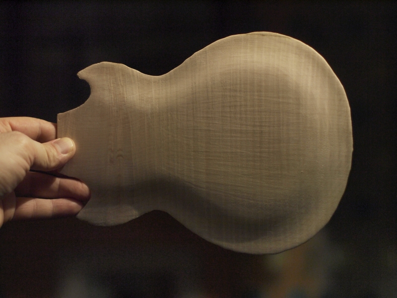 Tam gdzie doszedłem cyklinę (łabędziem) tam wyskrobałem, resztę - głównie w rogach - dotrę papierem łciernym, żeby nie było. Top dził wycięłem piłkę i zaczynam go pomału strugaę, żeby nadaę mu wypukłołę (strzałka od płaszczyzny klejenia - max 1cm). Na gryfie leży kawałek cocobolo na mostek. Dno zostawiłem na grubołę niewiele mniej od cm, szykuję cytomierz na zegarkowym czujniku, wtedy będę mierzył dokładnie.