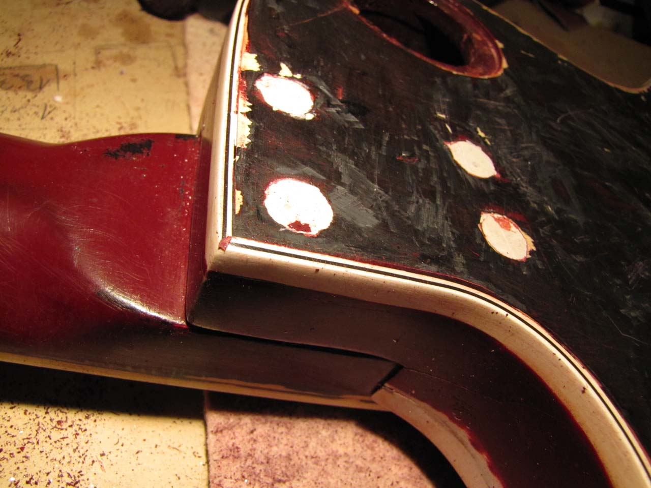 BTW co byłcie zrobili z tym? i tak muszę wydłubaę tę szpachlę, żeby ewentualnie zamaskowaę te dziury drewnianymi kołkami, ale... próbowalibyłcie odkręcię ten gryf do malowania?