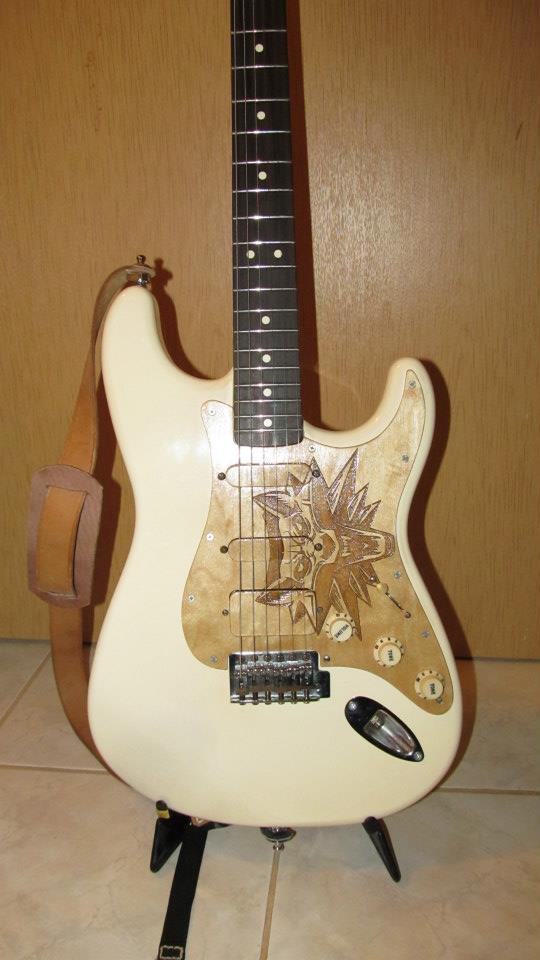 praktycznie zaraz po zakupie Fendera chciałem wymienię pickguard. Szukałem jednak czegoś nietypowego. W kołcu zdecydowałem się zaprojektowaę coś sam. Udało mi się znaleźć w internecie szablon o odpowiednich wymiarach. Niestety życie nie okazało się piękne i cały projekt tak czy siak musiałem ręcznie narysowaę w programie graficznym używajęc krzywych. Następnie dodałem głowę wilka (jako, że jestem fanem księżkowej sagi o Wiedęšłminie) i projekt zaniosłem do kumpla, który zajmuje się laserowym wycinaniem i wypalaniem przeróżnych rzeczy (właśnie dlatego projekt w krzywych). Oto co powstało