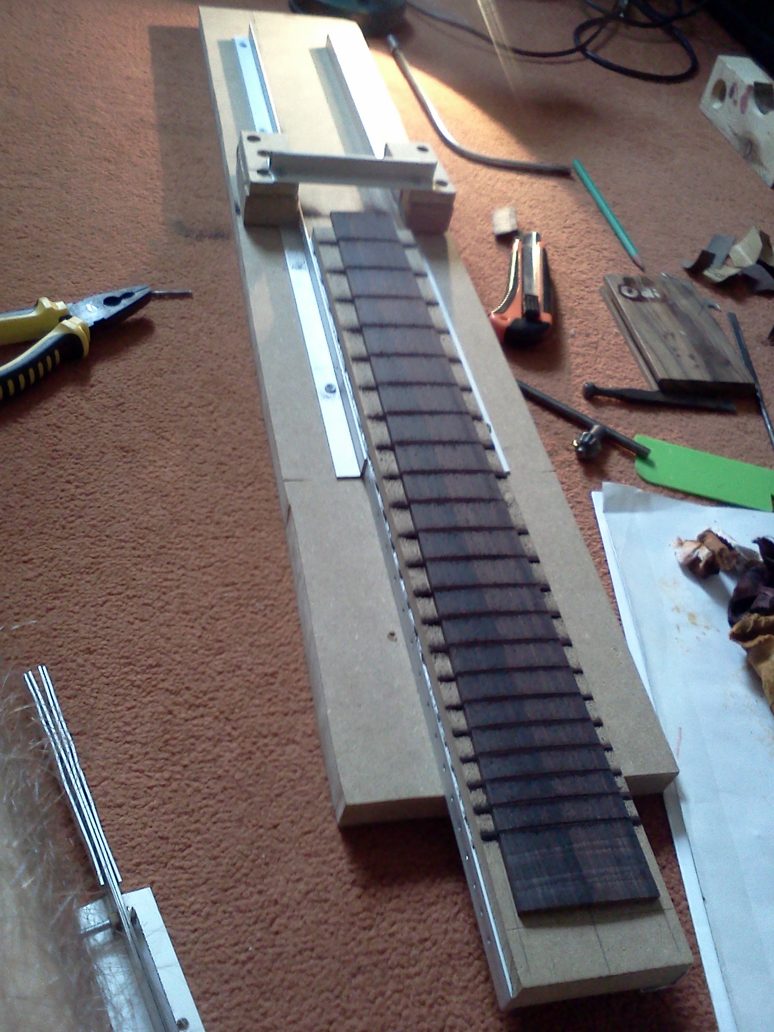 Na podstrunnicy wycięłem rowki na progi. Korytko niezbyt wygodne w użyciu, ale działa.