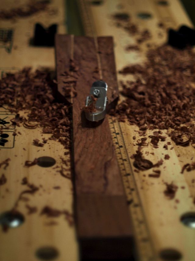 Trochę postrugałem, ale deska zaczyna nabieraę kształtów. Dalej, jako że w ruch idę pilniki i papier łcierny, koniec pracy w kuchni. Tak na prawdę najważniejsze przy gryfie co jest przede mnę to przygotowanie stopy do wklejenia boczków i płyty wierzchniej, trochę precyzyjnego dłubania, mam nadzieję, że się uda. W kolejnym połcie postaram się pokazaę już skołczony gryf, bez podstrunnicy, którę dokleję na koniec, gdy pudełko będzie zamknięte.