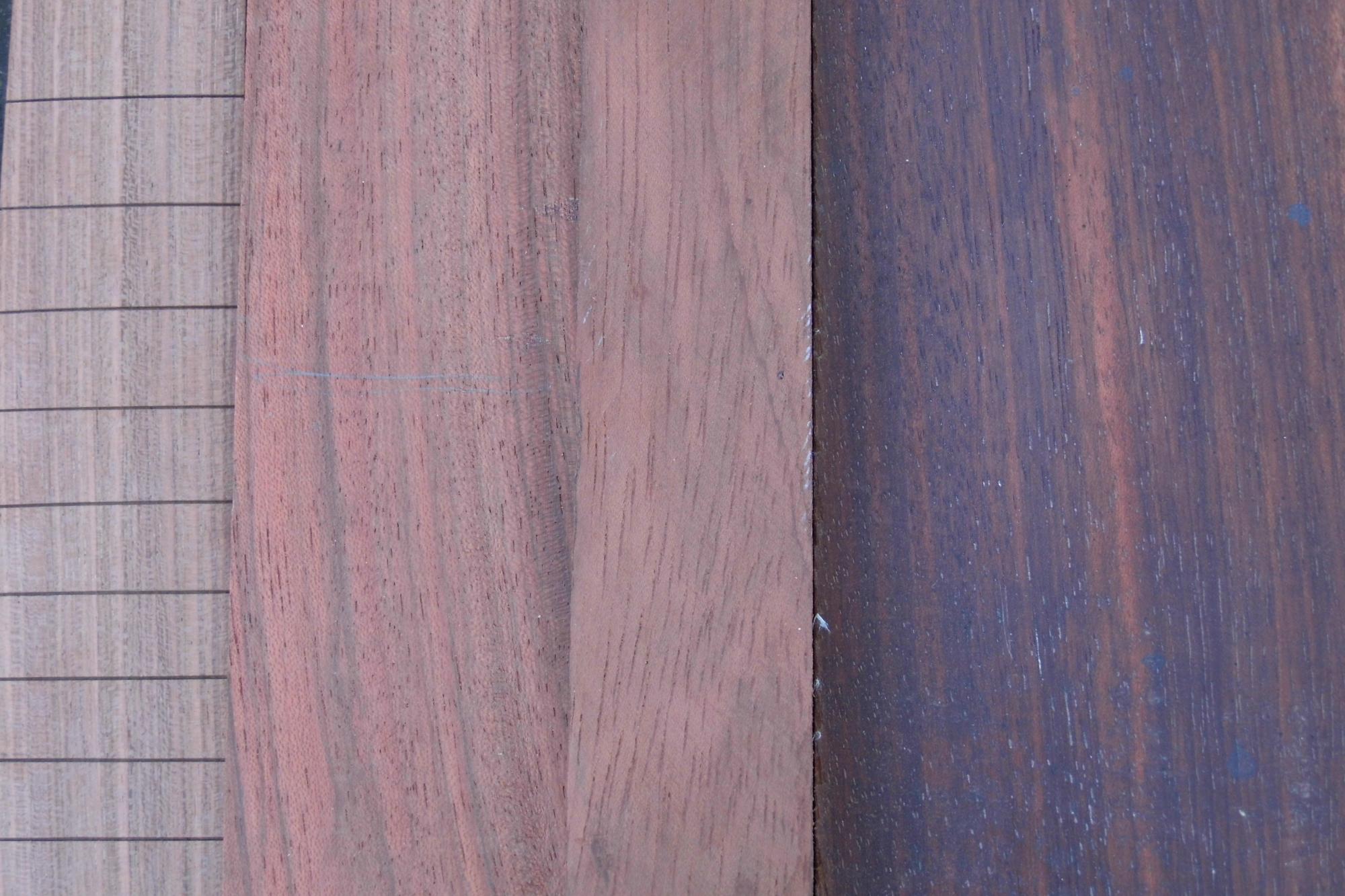 witam. mam problem z identyfikację drewna na zdjęciu jest jedna deska pocięta. od góry -surowa podstrunnica to łwieżo odcięty kawałek potem są dwa gdzie już minęł jakił czas i łciemniały i nabrały bardziej czerwonego koloru i na kołcu pomalowane lakierem. drewno jest dołc porowate a paznokieę pozostawia takie same wgłębienia jak w sapeli.
