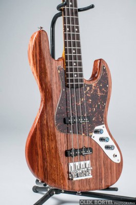 w tej chwili pracuję nad czymł w rodzaju telecaster basu ,ale tym razem z drewna które sam po raz pierwszy zakupiłem z przeznaczeniem na basy w postaci odziomka olchowego. po przetarciu okazało sie że 70% to taka zmurszała biel. wyjdę 2 basy z jednego kawałka drewna bez klejeł w tym ten właśnie,zamiast 6-8 sztuk. Gryf będzie z tego samego kawałka jawora co w tym Jazzie ale z doklejkami. reszta osprzetu też taka sama. Gryf już prawie gotowy tylko logo, progi i siodełko. Deska na razie zrobiona w 50% wilgotnołę 3,5% leży na grzejniku od pól roku a wczełniej 2 lata schło sobie w cieniu, żadnych pęknięę, klejeł... rozkosz w obróbce po bubindze. Z odpadu po jazzie zostało na "Bubinga Gospel Bass 5" ale tym razem sam będę musiał zrobię osprzęt do nowego typu gryfu no i gryf 5. Po tym jak odezwał się kawał blatu mam strasznę "chęę" na bubingowę 5kę. Więc może po telecasterze zrobię już, swój pierwszy całkowicie samodzielny instrument.