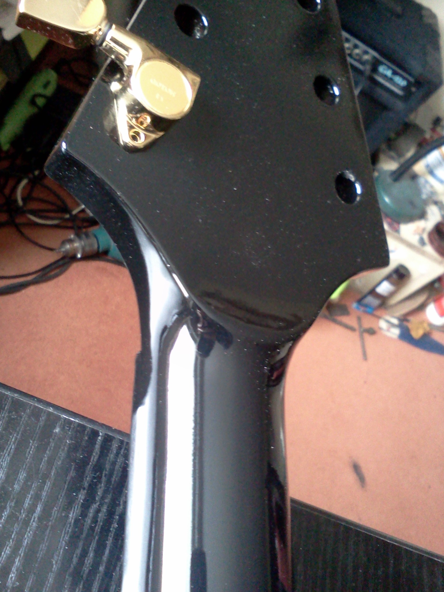Rozrobiłem przy tym za dużo lakieru, więc psiknęłem też resztę gitary. Większołę tego lakieru zeszlifowałem, traktujęc go jako pierwszę warstwę podkładu.