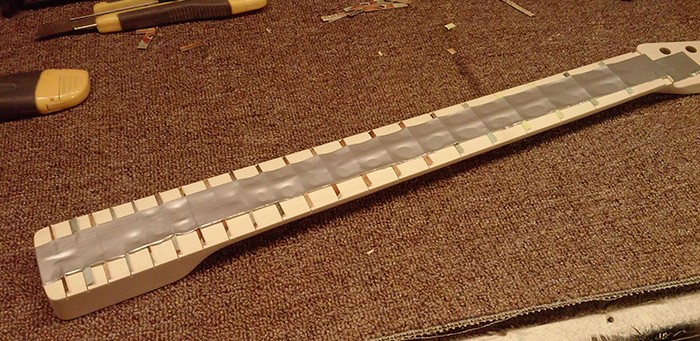 Ponieważ będę malowaę całołę nitro pędzlem muszę progi wstawię na samym kołcu po malowaniu i polerowaniu. Ubzdurałem sobie, że chcę aby nie dochodziły one do samej krawędzi szyjki , żeby kołcówki slotów były zapełnione masą drewnianę jak w niektórych starszych fenderach. Aby tego dokonaę już teraz musiałem je zapełnię zostawiajęc miejsce na progi. Przycięłem więc odpowiednie paski, zabezpieczyłem przed przesuwaniem, przygotowałem masą pyłowo-klejowę i wypełniłem co trzeba. Po wyschnięciu oszlifowałem wszystko i wuala