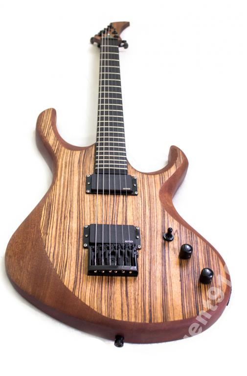 Na top został naklejony fornir Zebrano. Fornir, dla tego, że ograniczał mnie budżet. Podstrunnica z drewna hebanowego z radiusem 12 cali. Teraz czas na osprzęt. Przetworniki to EMG 81 oraz 85, mostek Schaller 3D, klucze Planet waves, blokowane. Siodełko Graph Tech. Gryf został wklejony w korpus. Jestem bardzo mile zaskoczony długim sustainem gitary.