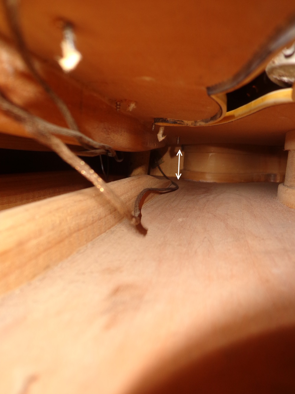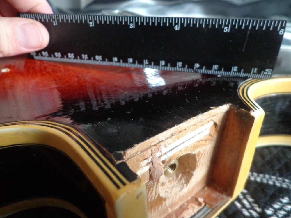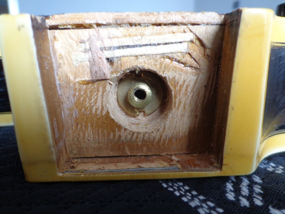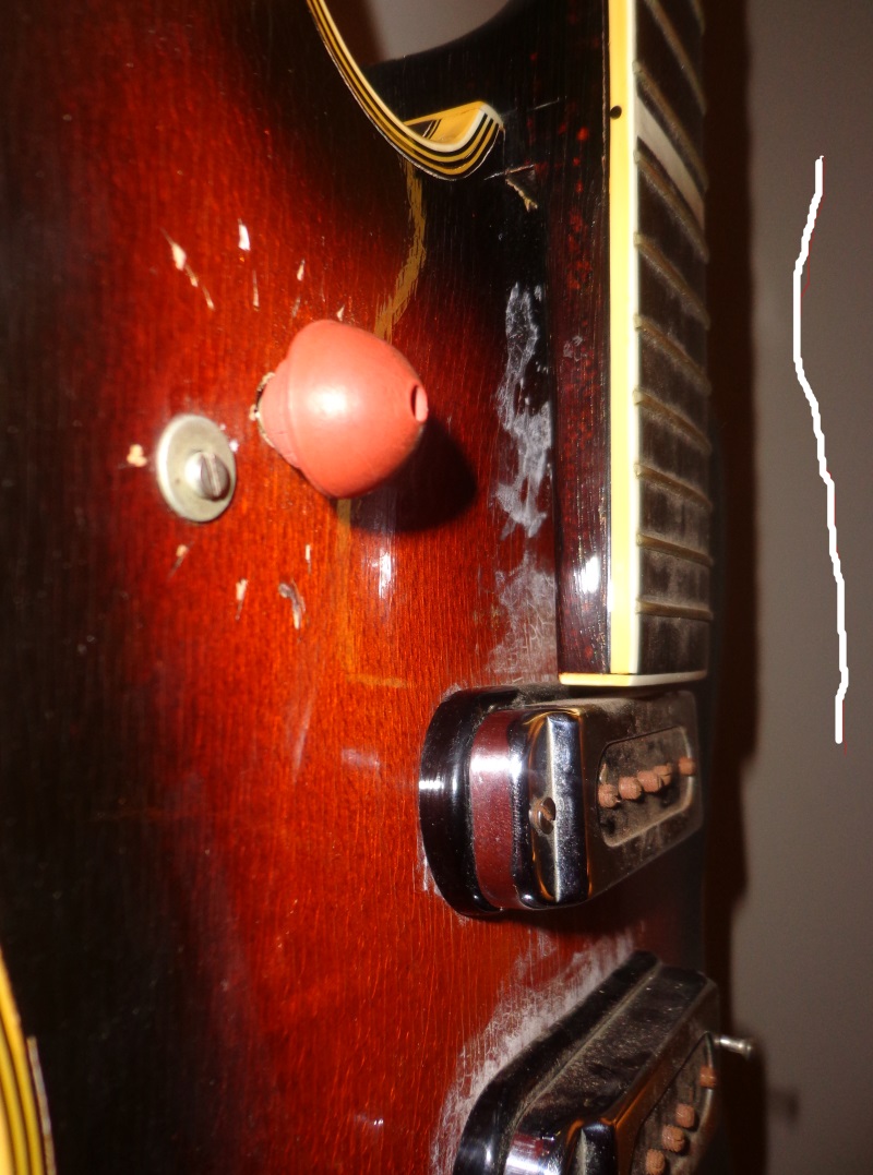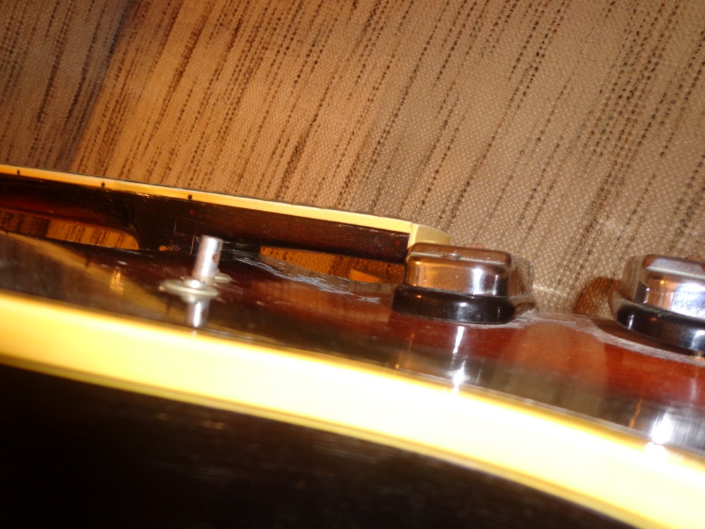 To rzeczywiłcie jest deformacja wtórna, a mogła powstaę na skutek nacisku tych pokazanych wczełniej na zdjęciach "podpórek", gdy komuł się poluzował gryf i nie umiał go dokręcię.