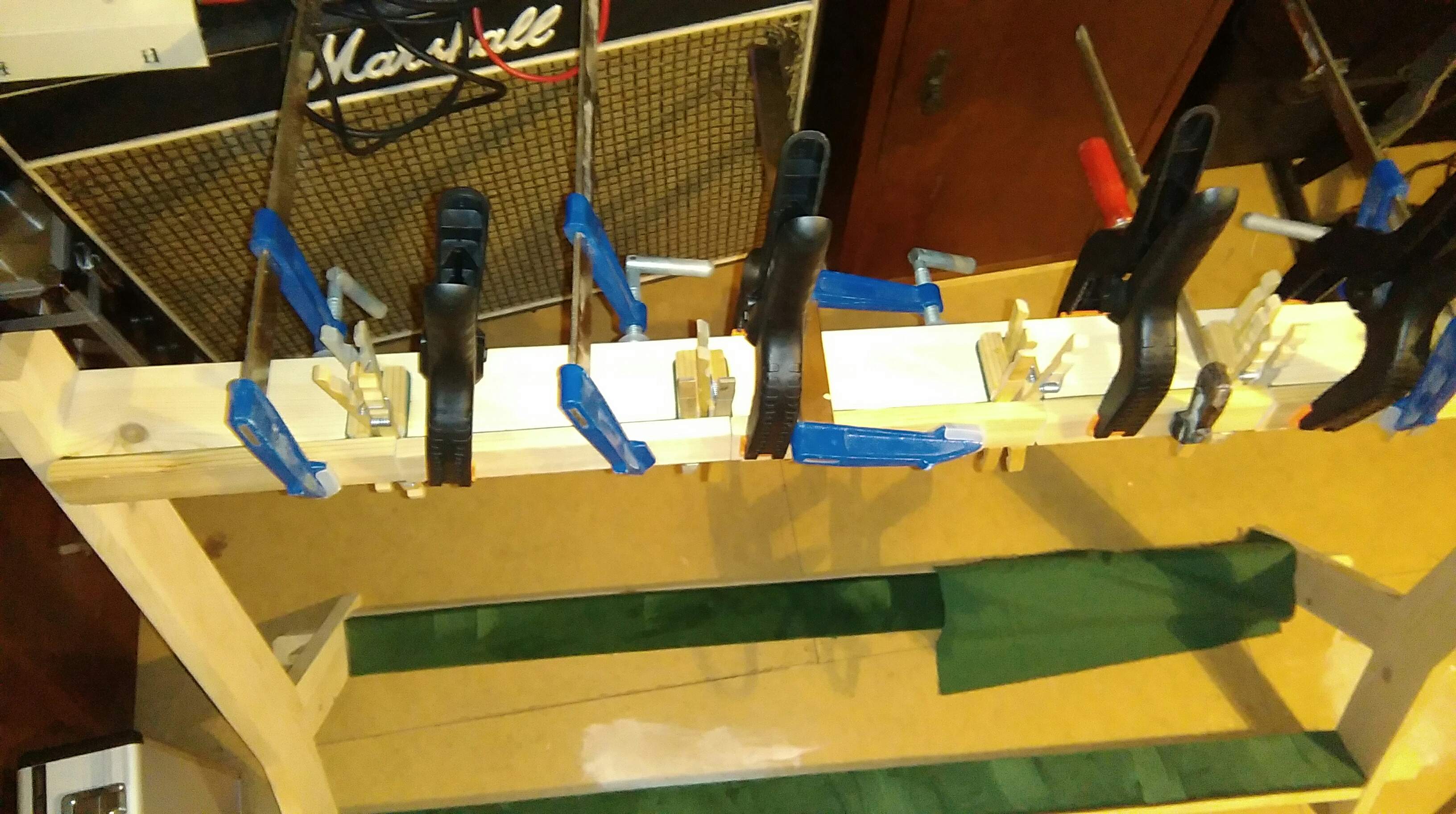 Dolne deski nie stworzyły żadnego problemu. Użyłem takiej oto pianki: Owinęłem to materiałem i przykleiłem takim klejem: Z górę za to było już trochę zabawy. Wymyłliłem sobie, że będzie ładnie wyględało jak nakleję materiał tylko na krawędęšł. W tym celu do tałmy dwustronnej 19mm przykleiłem materiał, w taki oto sposób: Tak przygotowany pasek trzeba było jakoł ładnie wkleię w sloty. Nie za bardzo wiedziałem jak, najpierw próbowałem z balonikiem, ale po kilku próbach stanęło na tm, że użyłem klamerek jako kliników: Moim zdaniem wyszło całkiem nieęšłle: A oto finalny produkt: I jeszcze z gitarkami: Musze jeszcze nadmienię, ze dodałem również wzmocnienia w postaci 45mm szerokich listew pod dolnymi deskami i jakieł 30mm szerokołci listwa pod górnę deskę, za slotami. 6 gitar jednak trochę waży...