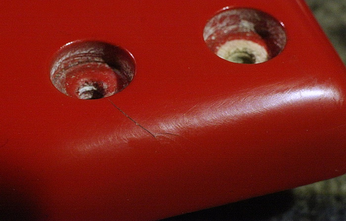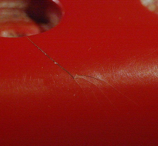 Spotkała mnie niemiła niespodzianka, w czasie szlifowania powłoki papierem wodnym pojawiło się pęknięcie lakieru. Byę może mikropęknięcie było już wczełniej, a dopiero teraz wylazło, w sumie nie ważne, teraz trzeba to naprawię i to najlepiej bez zdzierania całołci do 'gołego'.