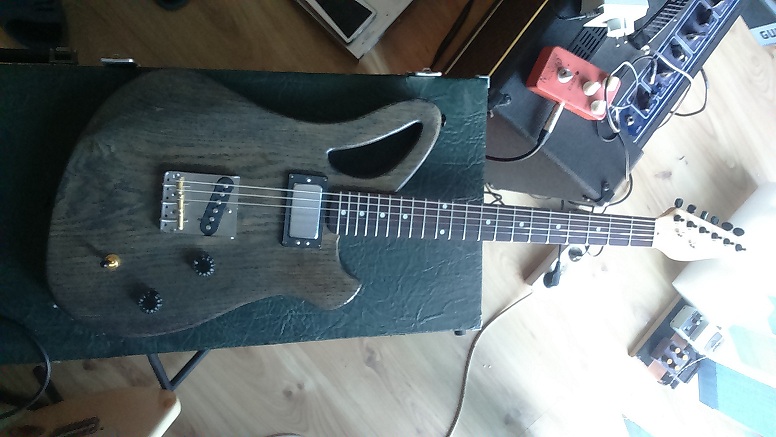 Witam szanownych Panów serdecznie nie dawno zostałem posiadaczem bardzo starej dębowej deski i pomyłleliłmy z moim ojcem czy by nie spróbowaę stworzyę gitary i wyszło ogólnie coś takiego.Gryf jest stety niestety używany menzura 25,5", 21 progów.