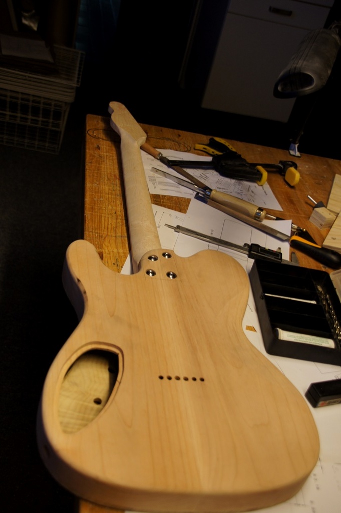Nie daję tulei bo i po co, nie ma problemu z przewlekaniem strun, tymczasem tele nabiera kształtu