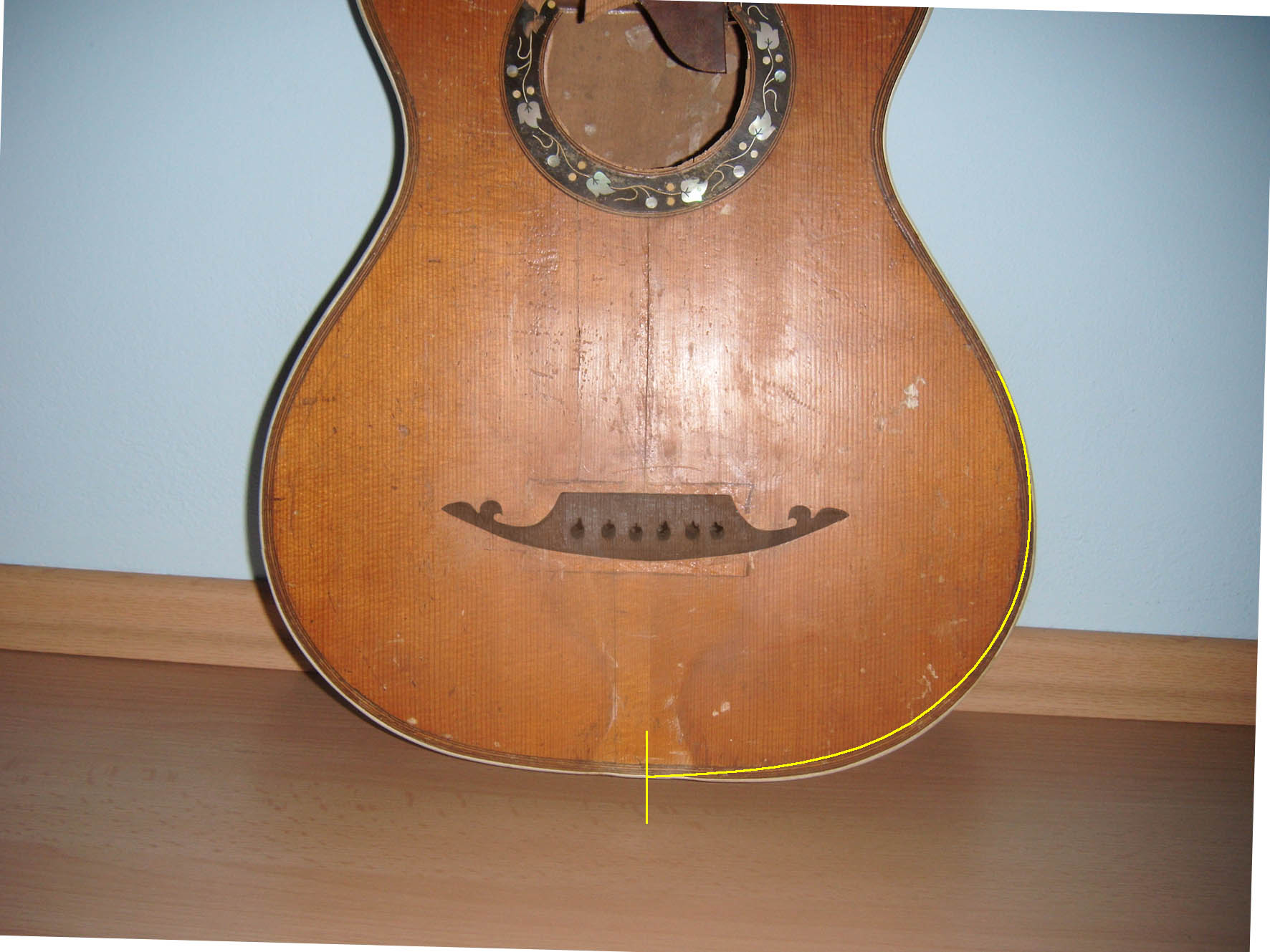 Nie mam pojęcia czy tak lutnikowi wyszło czy jest to zamierzony efekt. Brakuje mostka, jednak wyraęšłny łlad po nim pozwolił mi graficznie odtworzyę jego charakterystyczny kształt. Widaę również że gitara miała póęšłniej dorobiony inny mostek bo jego łlad również się odcisnęł. Dziwię mnie te otwory po kołkach bo ta gitara pierwotnie zbudowana była niemal na pewno pod struny jelitowe (nylonowe). Ta piękna rozeta wokół otworu rezonansowego budzi podejrzenia, że nie jest to jakił tani wyrób dawnego rzemiosła. Moję ambicję jest przywrócię do życia ten uroczy instrumencik. Będę wdzięczny za pomoc w ustaleniu co to za gitara i gdzie szukaę odpowiednika na którym można by się wzorowaę.