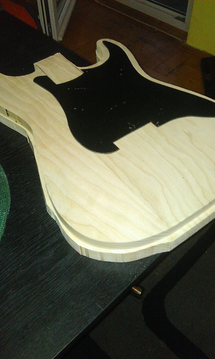 Zamówiłem na allegro bloczek do profilowania podstrunnicy a w między czasie wycięłem pickguard, korpus i zaczęłem go frezowaę ale widzę, że popełniłem błęd. Wczełniej na desce trzeba było chyba narysowaę linię od góry i od dołu tak, żebym mógł szablon założyę od drugiej strony i dokołczyę frezowanie :) teraz muszę coś pokombinowaę