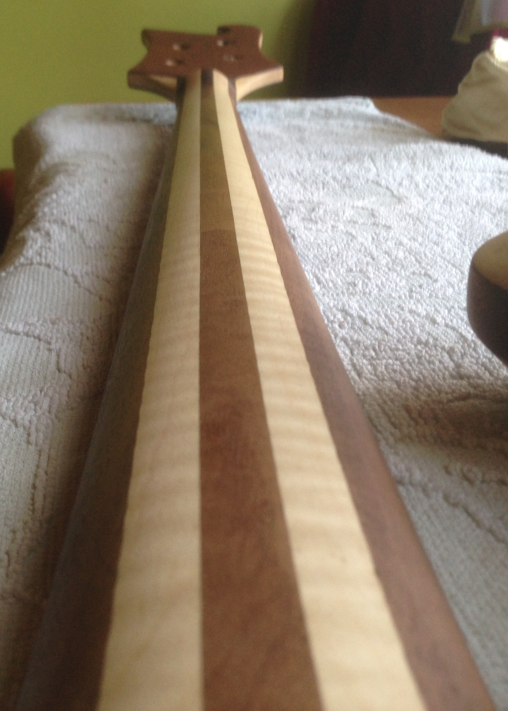 Podczas budowy pierwszego basu nie wyszła mi idealnie kieszeń gryfu, więc w tym przypadku nie musiałem jej frezować, a uzyskałem ją poprzez odpowiednią konstrukcję korpusu. Jak widać paski klonu nie są równoległe.