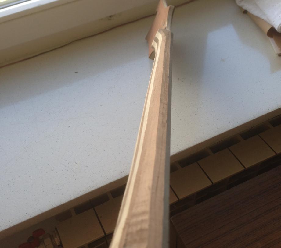 Początek obróbki gryfu zacząłem od zebrania materiału frezem skośnym 45*. Widać także że z tyłu główki jest warstwa forniru mahoniowego.
