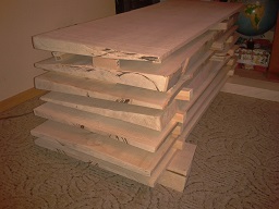 Teraz te grube 5,5cm kloce trafiły na tartak, gdzie po szczegółowych konsultacjach, po naostrzonej pile tałmowej i przy pomocy jeszcze kilku majstrów wspólnie pocięliłmy to na kliny i cienkie plastry.