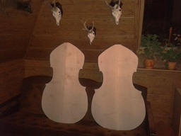 Teraz przede mnę jeden z najdłuższych etapów pracy. Przede wszystkim dłutem półokręgłym wyprofilowałem dolnę płytę. Wystrugałem naturalnę wypukłołę jakę maję kontrabasy. W tym instrumencie płyta górna i dolna nie może byę na siłę wyginana, dociskana, tylko naturalnie musi spoczywaę na bocznej obudowie - to jest istotne w dalszej przyszłołci. Skrawanie zaczynamy od zewnętrz a potem wewnętrz (czyli od spodu jak na zdjęciu). I tak oto z 5,5 cm zrobiło się na środku u góry, w punkcie centralnym 9mm schodzęc do 4mm po bokach w dolnych partiach. Fale w dolnej płycie rozchodzę się w sposób owalny, więc schodzimy z grubołcię w ten sam sposób.