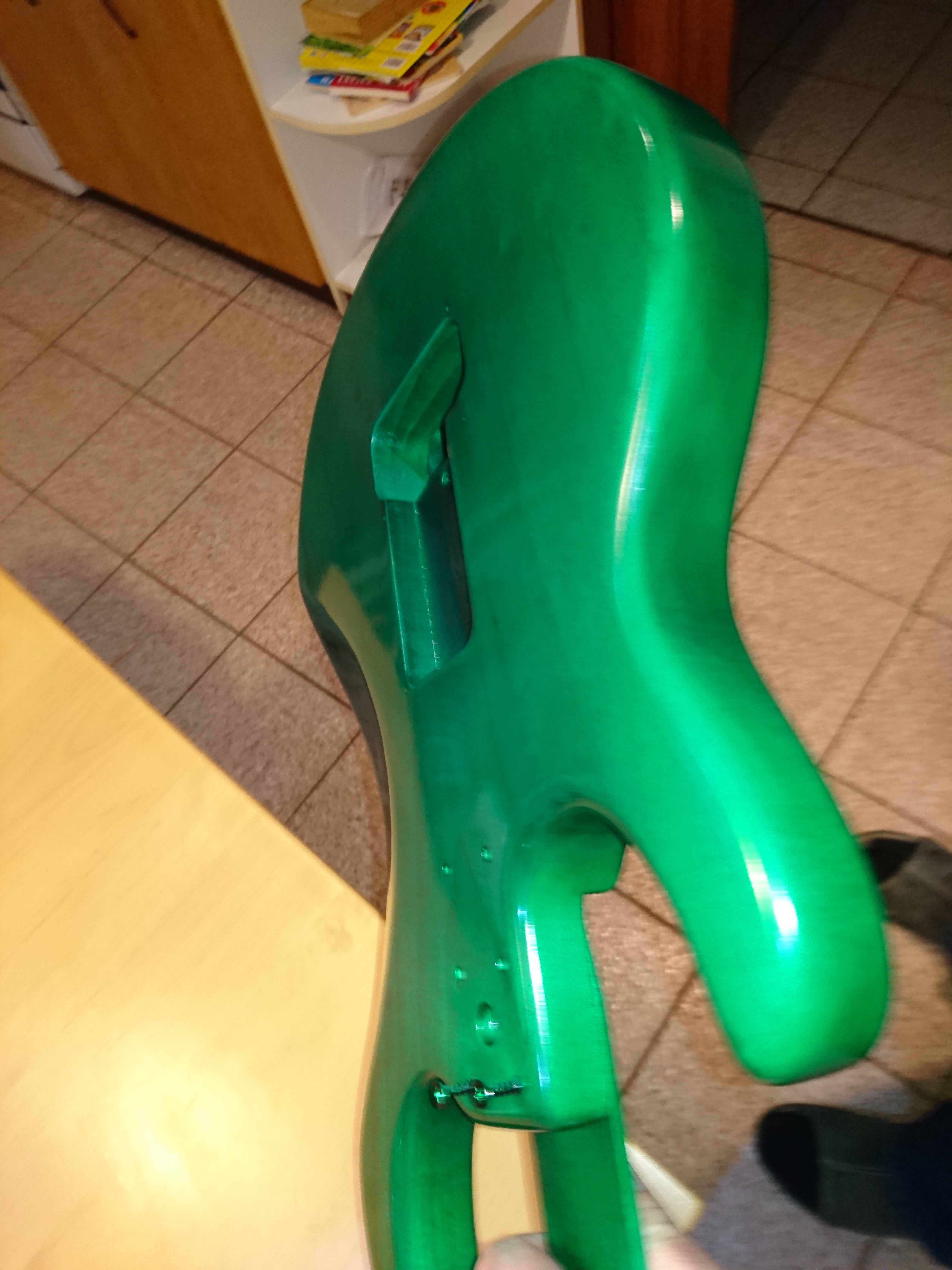 Następnie przygotowałem sobie lakier barwięcy - chciałem byę możliwie blisko oryginału ale bez wchodzenia w niebieski odcieł a pozostajęc przy soczystej zieleni - w wspomnianym wyżej serwisie nabyłem pigment o nazwie soczysta zieleł i zmieszałem go z lakierem nitro tego samego producenta co podkład (który w międzyczasie zamówiłem, jako, że tak bardzo mi się podkład podobał). Następnie pistoletem (w który w międzczasie się postarałem) prysnęłem pierwszę warstwę lakieru, kolor wyszedł dobrze ale ponieważ ustawienia pistoletu i moja technika nie były włałciwe musiałem całołę delikatnie przeszlifowaę (tym razem papier 400 - lakier nitro okazał się byę też dołę twardy) i po kilku godzinach już drugi raz mogłem prysnęę.
