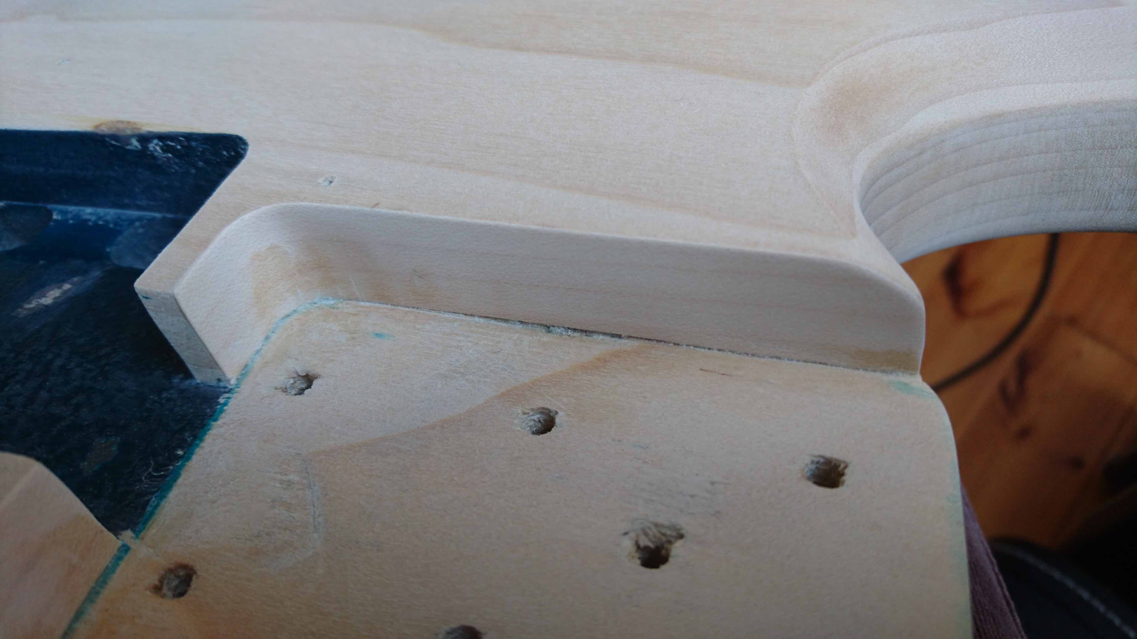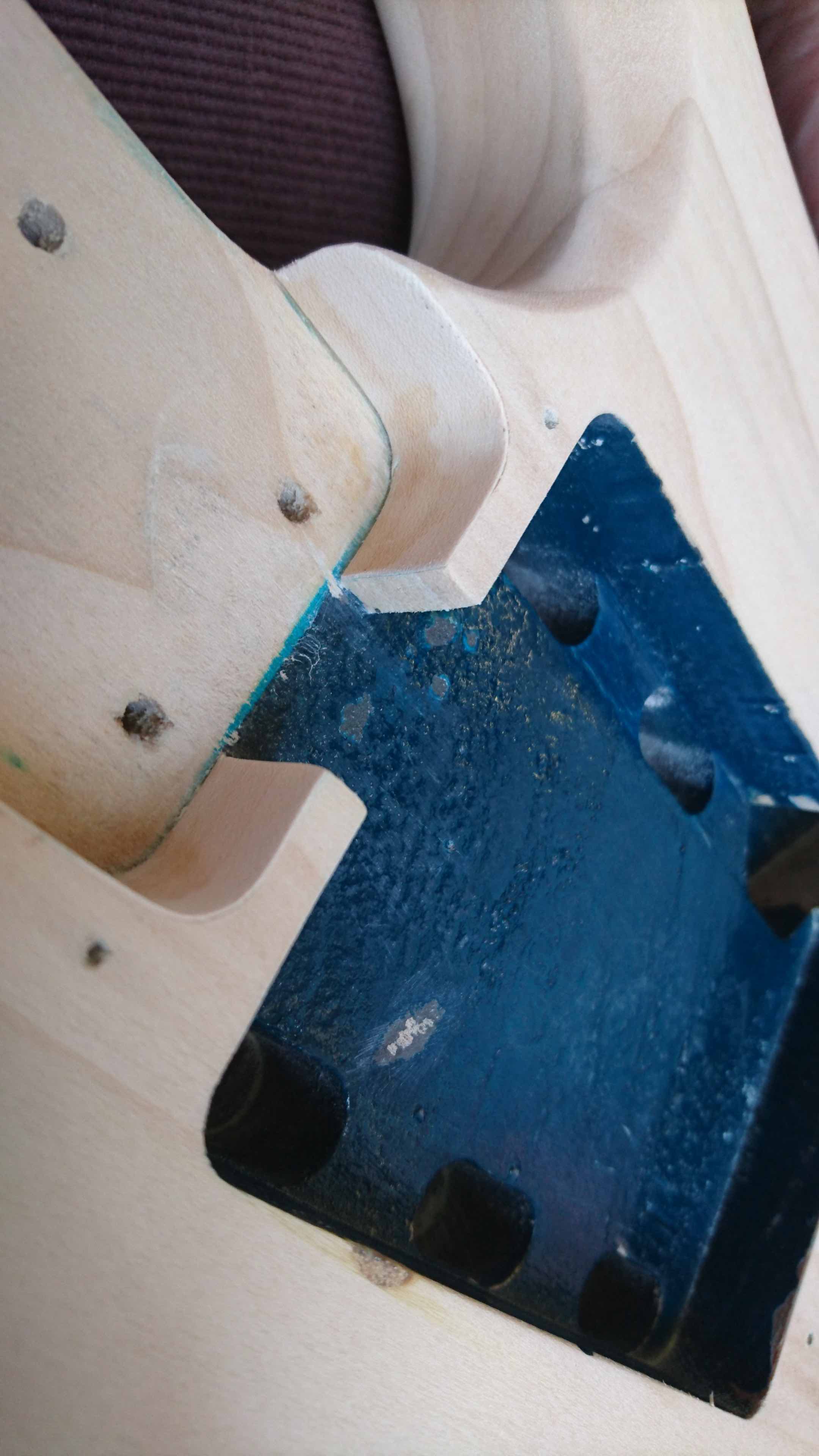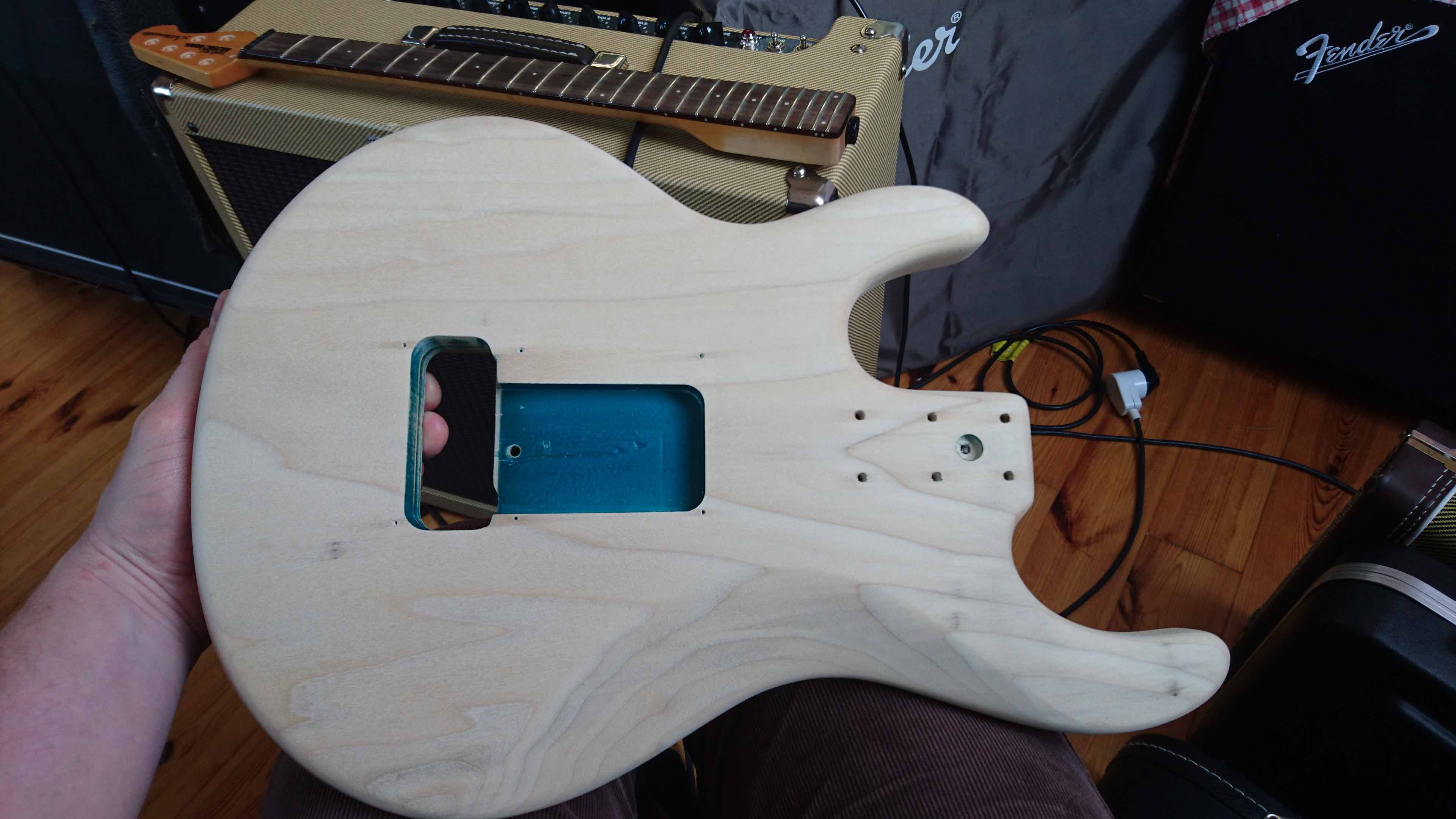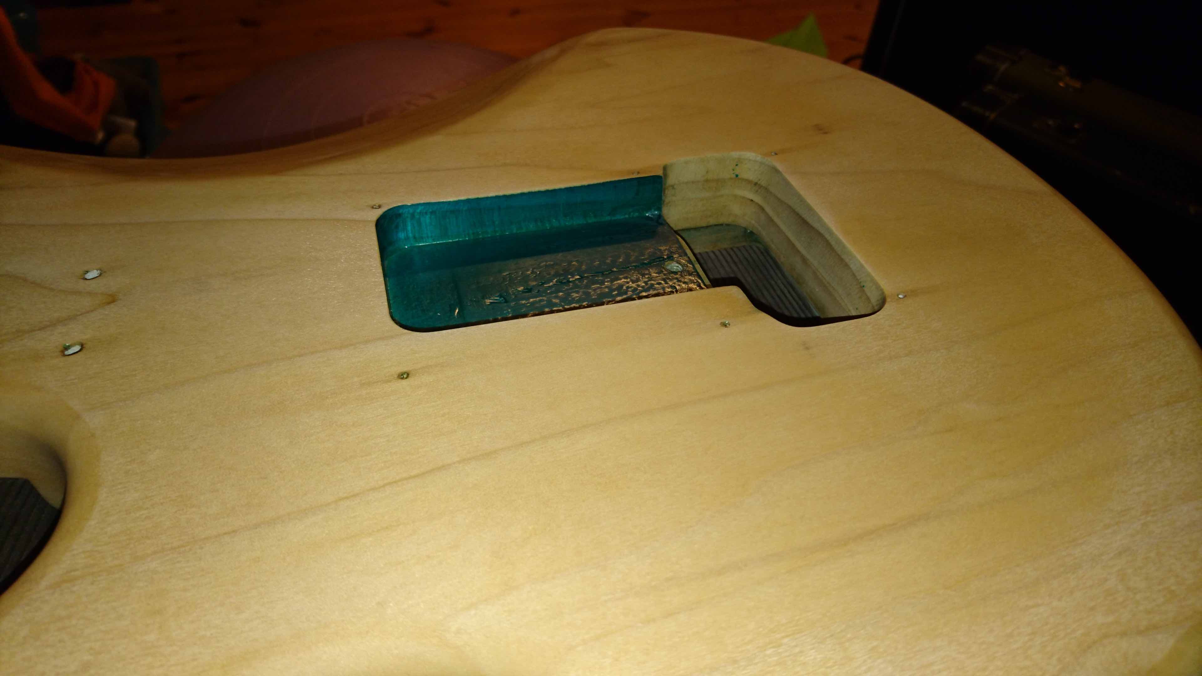 Aha bym zapomniał, w kieszeni na gryf była (domyłlam się, że fabrycznie) podkładka o grubołci okolo 0,8 mm z jakiegoł twardego tworzywa sztucznego lub może czegoś w rodzaju tekstolitu czy bakelitu, a że nie jestem miłołnikiem czegoś takiego to z forniru (klon/jawor o grubołę około 0,6 mm) zrobiłem "wkładkę" do całej kieszeni pod gryf co widaę na jednym z wczełniejszych zdjęę.
