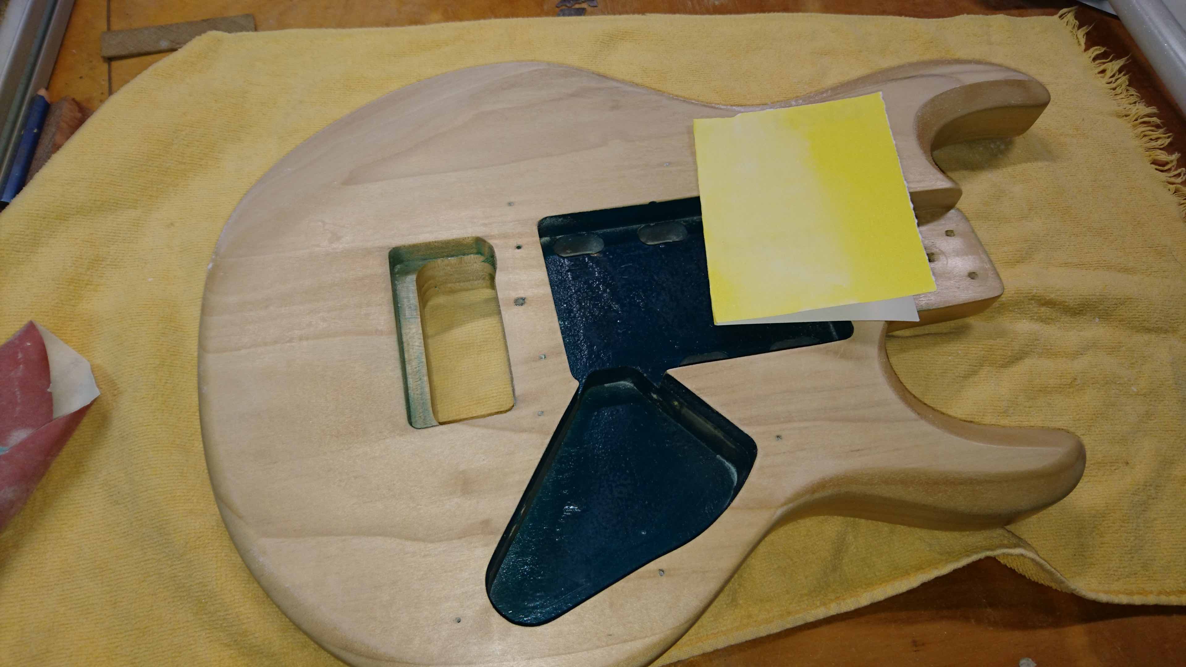 Okazało się, że wbrew temu co młlałem gitara nie była bejcowana tylko miała podkład odcinajęcy lakier barwny od drewna i na to jeszcze lakier bezbarwny, czyli 3 warstwy.