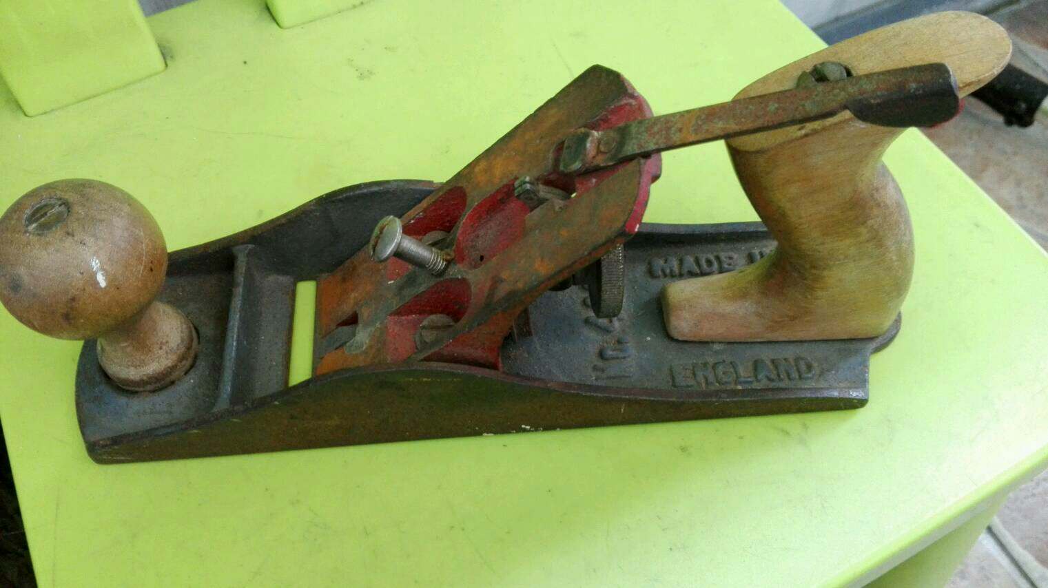 Zainspirowany Dziełem Ryszarda nabyłem okazjonalnie angielski strug za 20 zł bez noża, łamacza i docisku i z tego spróbuję zrobię coś co kolega robił całkowicie sam ja postaram się tylko zrobię mocowanie 90* a bazę ma byę tenże strug. Ceny oryginalnych kładę na łopatki.Wydaje mi się, że łatwiej mi będzie to zrobię na bazie struga niż wszystko robię od podstaw. Stopa jest do planowania ale poza tym strug w przyzwoitym stanie - no poza brakiem tych rzeczy które wymieniłem.