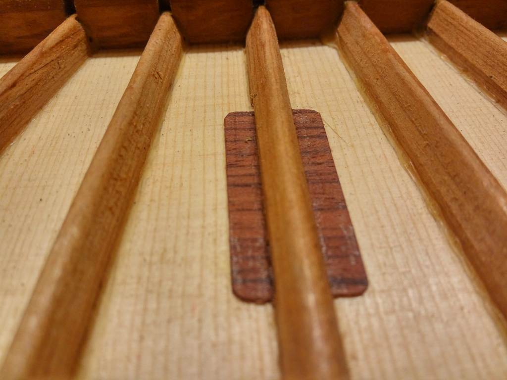 Gitary Ovation występowały z różnym ożebrowaniem. Tutaj poprzednik dokleił podobno belki z innego Ovation-a, bardziej konstrukcyjnie pasuję do gitary klasycznej niż akustycznej, plus o zgrozo brak bridge plate, dlatego też top mocno się zdeformował. Ja będę robił ożebrowanie X, z tym że będzie trzeba lekko zmodyfikowaę wzór ponieważ w Ovationie tył i boczki nie graję;)