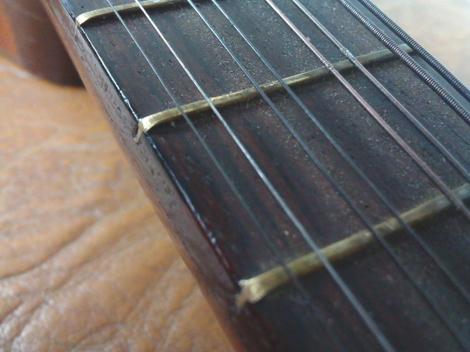 1/ Wymienione 13 progów, co nie sprawiło problemu, pozostałe założę przy poprawce sklejenia tylnej płyty i ożebrowania poprzecznego.Drut progowy sintoms o szerokołci 1,5mm z aledrogo, rowki przygotowałem pilnikiem do paznokci z Ukrainy z dodatkiem pyłu szafirowego, na bazarku kosztował 1,50zł Niestety przy wciskaniu 11 progu coś tryknęło i jakieł klejenie konstrukcyjne dało o sobie znaę (rozklejenie). Poprawiajęc tył będę miał lepsze pole manewru do wciłnięcia podkładek, które muszę byę grube z racji rozmiarów belek.Oczywiłcie przed progami wyrównałem krzywiznę gryfu papierem na poziomicy.