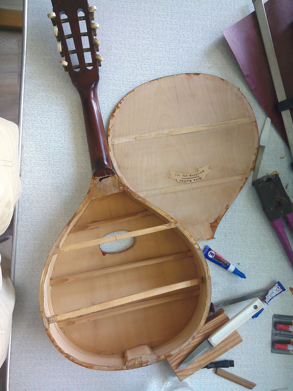 Popełniłem ostatnio zakup na niemieckim eBay instrumentu z lat 30stych minionego wieku za 30 Jurków, po prostu nie mogłem inaczej. Płyta wierzchnia w dobrym stanie, gryf prosty, odklejona płyta spodnia , progi na gryfie do wymiany, bo przesuwajęc po strunach paznokciami prawie że wbijaję się w nie, takie są zaostrzone.Mechanizmy do nakręcania strun stawiaję solidny opór pomimo pryłnięcia smarem.Mostek pod grubymi strunami spróchniały i zapada się pod ich naciskiem. Poniżej załęczam zdjęcia.