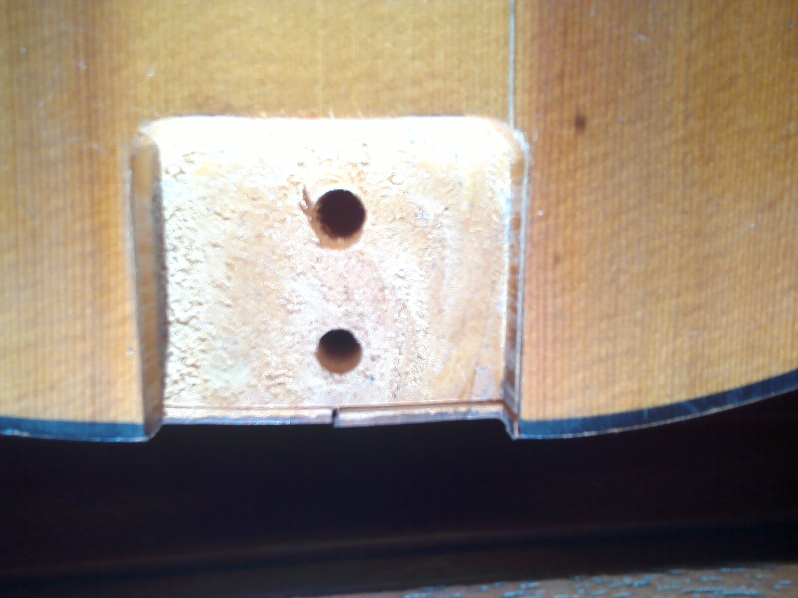 Pozostało niewykołczone miejsce po starym mostku, albo je zapełnię kropelkę aby usztywnię- tylko wyględaę będzie inaczej z racji koloru; druga możliwołę to politura zapełni nierównołci. Mostek zrobię ruchomy, a strunocięg zrobię metalowy- samoróbka.