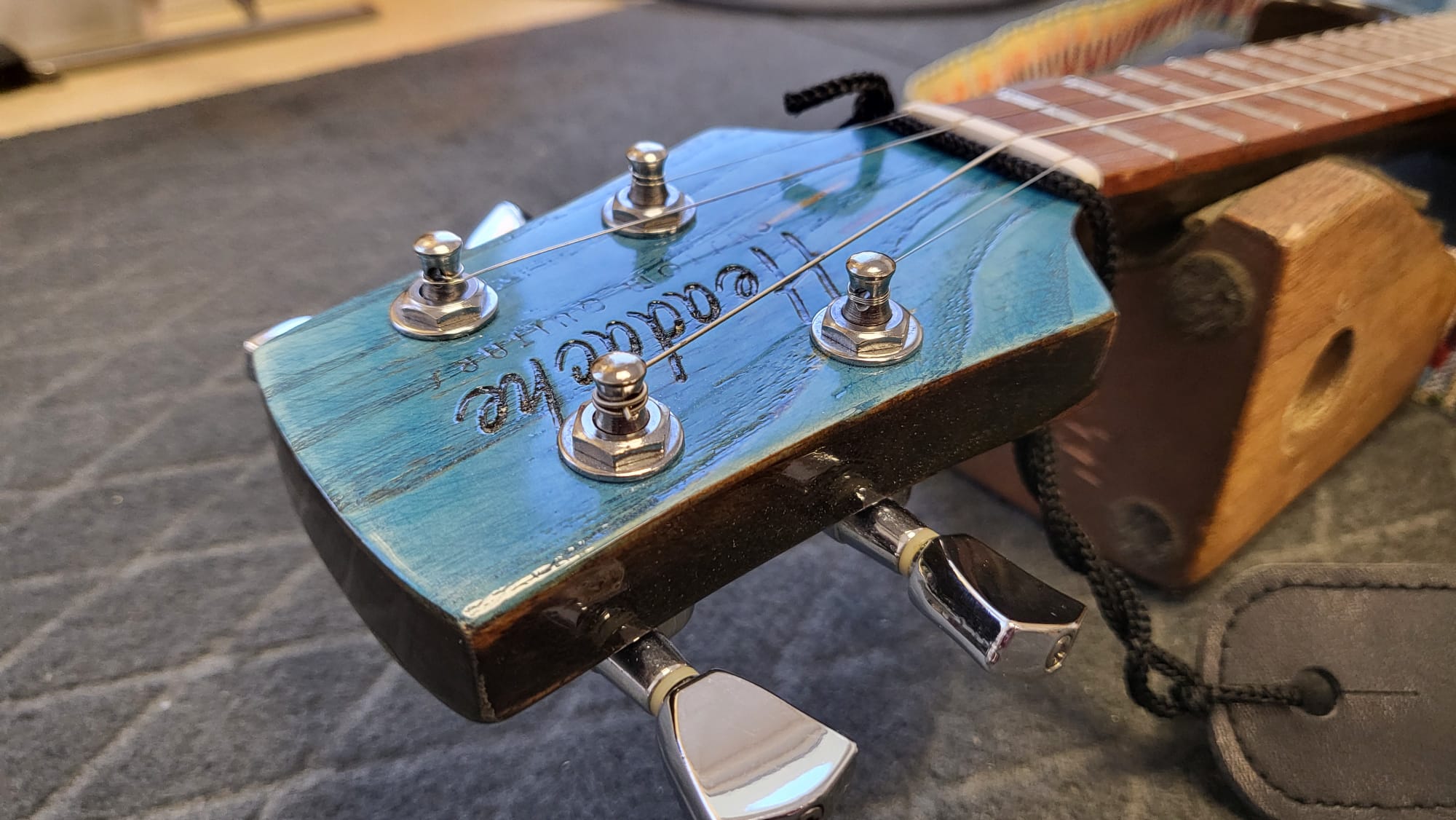 Dwa ukulele sopranowe od Mahalo (modele z 2010 i 2020 roku), mahoniowe "guitalele" Eagletone Guitarrita Acajou oraz najdziwniejszy wynalazek, jaki posiadam - oryginalnie nazywało się to-to Small Foot by Legler (firma zabawkowa z Niemiec), ale po moich "udoskonaleniach" okazało się być całkiem przyzwoitym mini-stratocasterem (dla żartu na główce zrobiłem logo "Fender mini-defender")