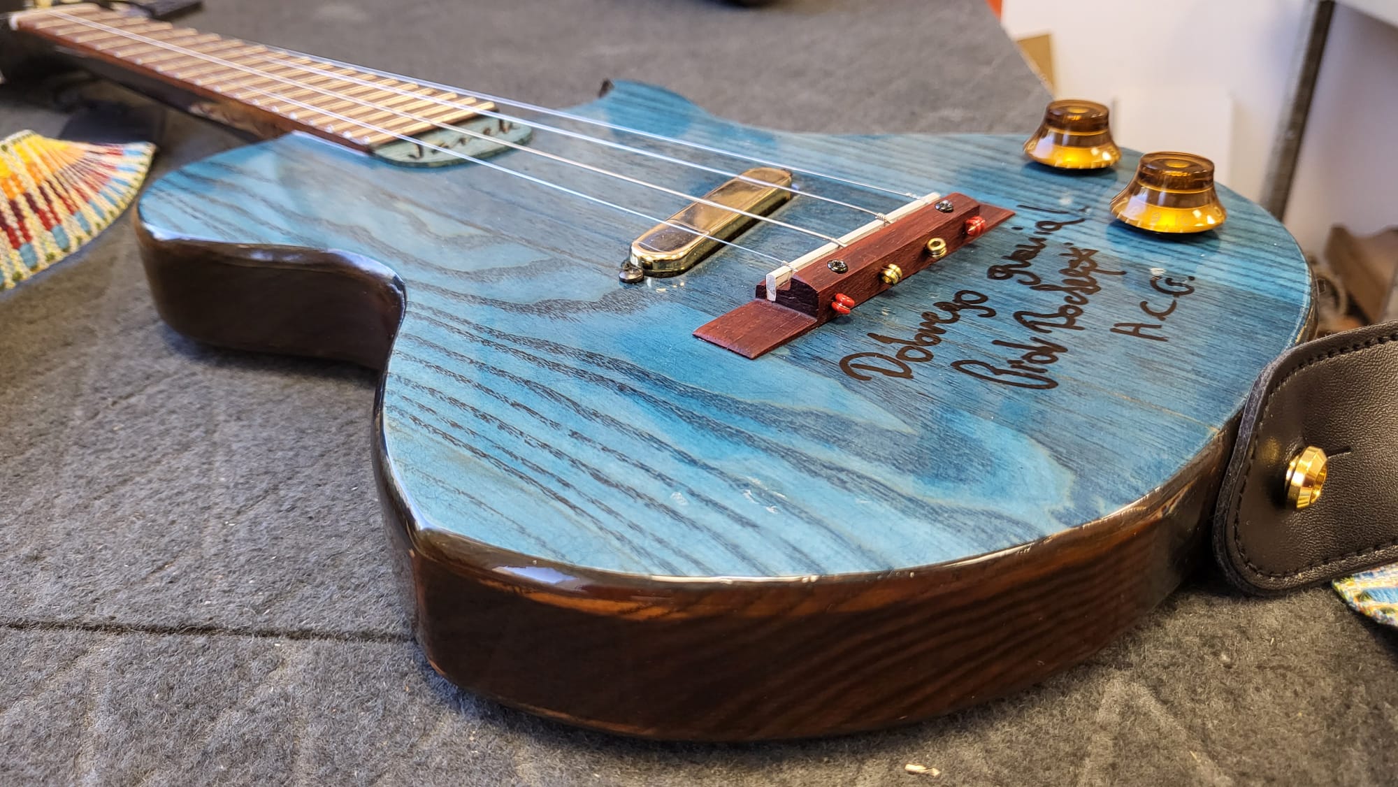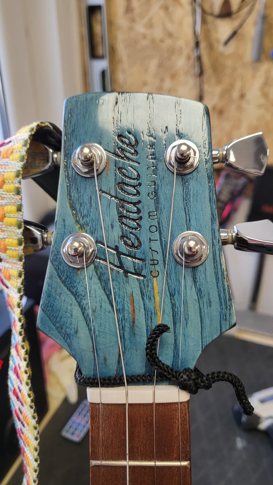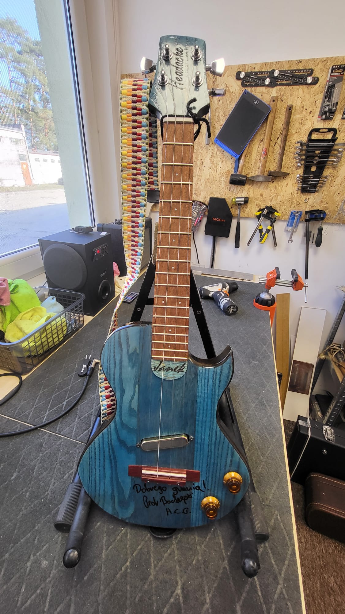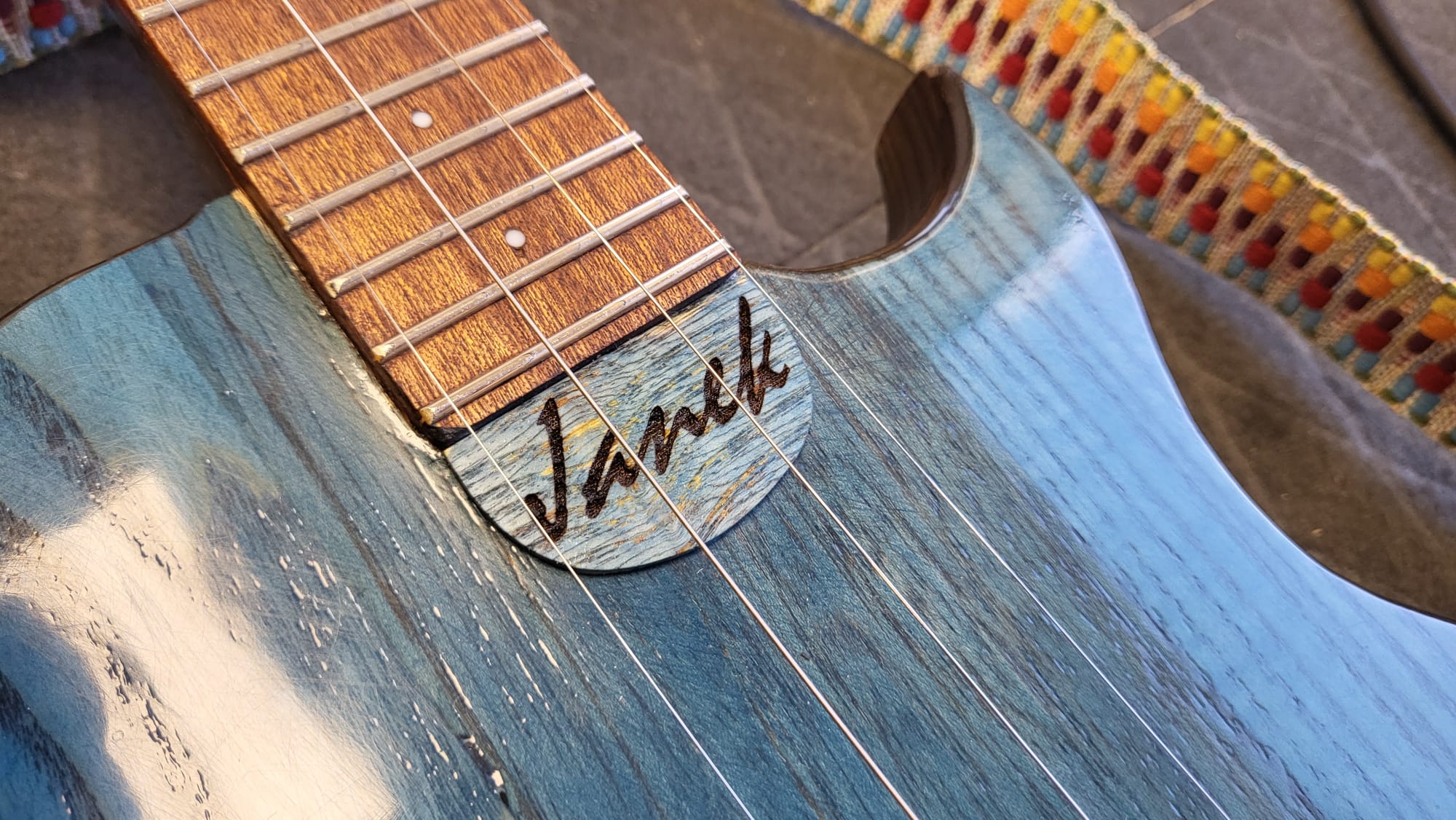Szalone ukulele! Jakiś czas temu zgłosił się do mnie Adam Gajda, tata Janka. Janek jest 14-letnim aspergerem z pasją do grania. Rozmawialiśmy o wysłaniu jakiś gadżetów, koszulek itd., bo Janek kolekcjonuje takowe. Od słowa do słowa wyszło, że marzy mu się elektryczne ukulele. Dostał już gitarę od Strachy Na Lachy , wzmacniacz i gadżety od Ukryty Wymiar oraz Chłopcy z Placu Broni , ale ukulele nie ma. Postanowiłem więc takowe dla niego zmajstrować. Jest w jego kolorze, z sygnaturą imienna, specjalnie zwiększony rozstaw strun, żeby mu się wygodnie grało. Nie wiem, czy ktoś coś takiego już robił, ale ja zrobiłem i radość niech właścicielowi przynosi tak jak mnie przyniosło zbudowanie jego😉