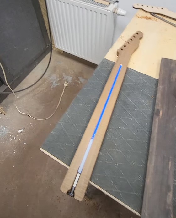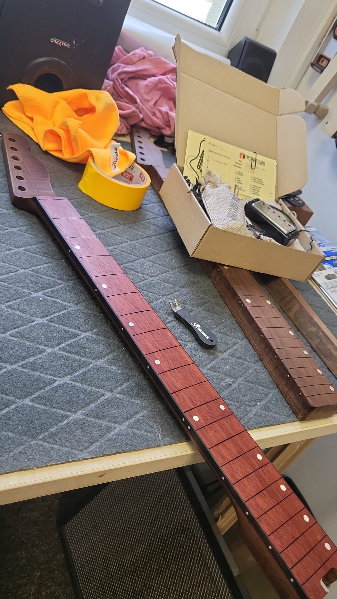 Pręt osadzony, podstrunnica przyklejona. Nie planowałem bindingu, ale kiedy wyrównywałem podstrunnicę do gryfu okazało się,ze nie zmieniłem łożyska we frezie i poszło frezowanie pod bindę. Takze będzie binda.