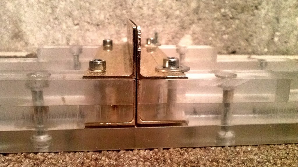 Materiały, to kawałek poziomicy/łaty odzyskany z uszkodzonej, PMM czyli polimetakrylan metylu - pleksi 10 mm, łruby imbusowe M6, sruby M8, pokrętła M6, łożyska 608 zz/1 zł/szt. na allegro/.