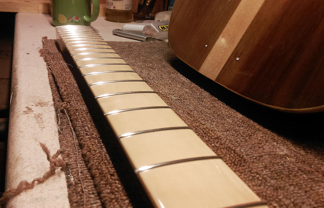 Ciężko będzie wykołczyę progi na takim polakierowanym już gryfie. Zanim zabierzesz się za prace z progami sugerowałbym dokładne zabezpieczenie dobrę tałmę powierzchni lakierowanej gryfu.