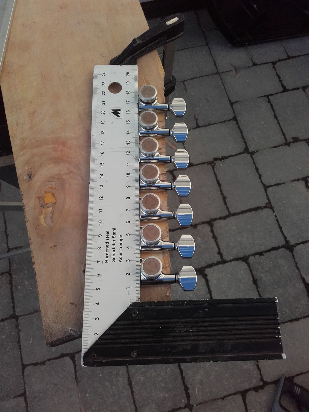 Na sklejce zamontowałem most i klucze oczywiłcie wymierzajęc menzurę 25,5. Wykorzystałem docelowy set strun 10-60