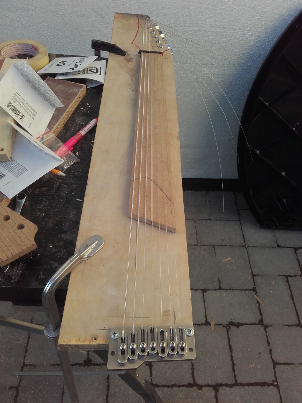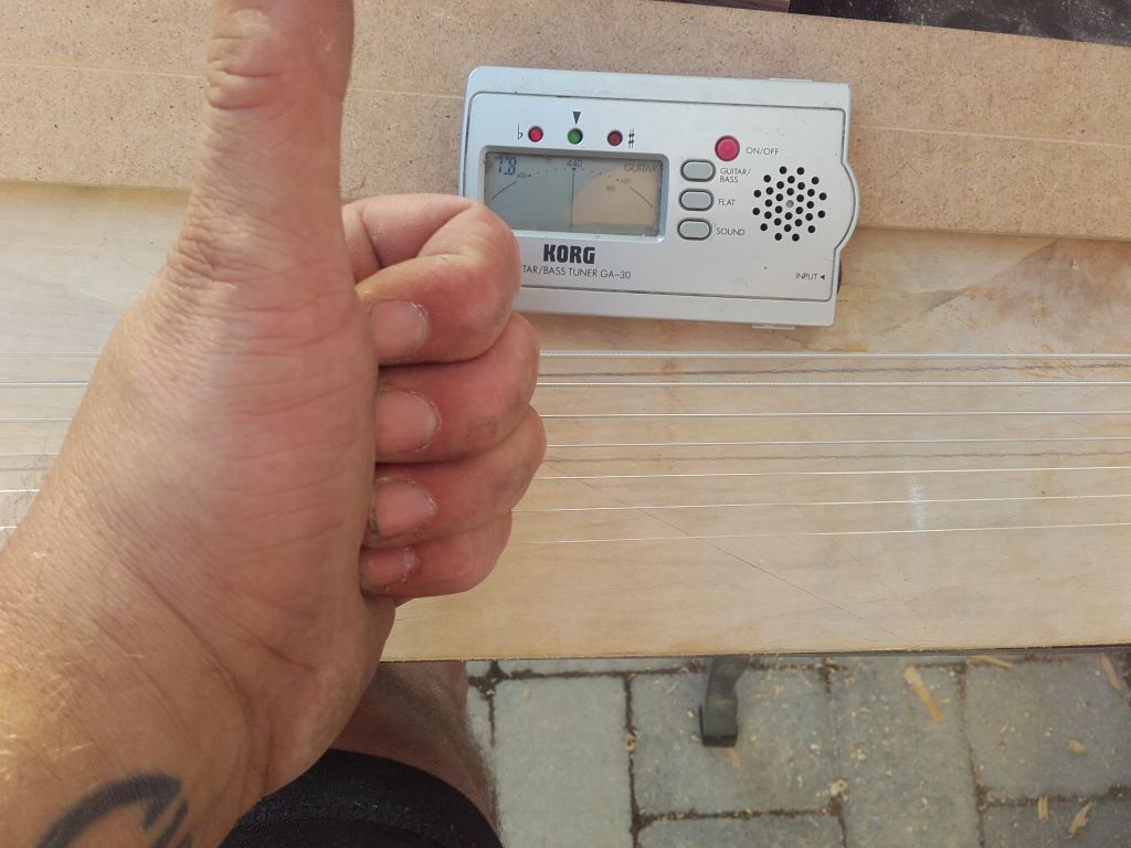 Na szybko zrobione siodełko z kawałka hebanu(docelowo mosiędz) i układ strun. Kęt jest Ok