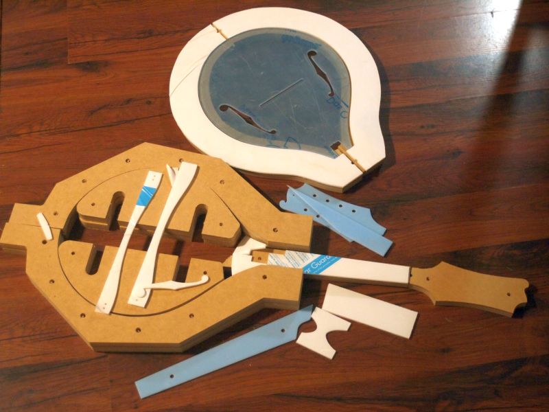 Lada moment doklejam tę spodnię płytę - lubię ten stan, choę pudełko wierzchem nie zamknięte - to już jest efekt/wrażenie całego instrumentu. Na razie mam rakietę tenisowę czyli gryf z boczkami i kerfingiem (tfu..) - trójkęcikami. Kto wie, może do kołca miesięca będzie mandolina na biało?