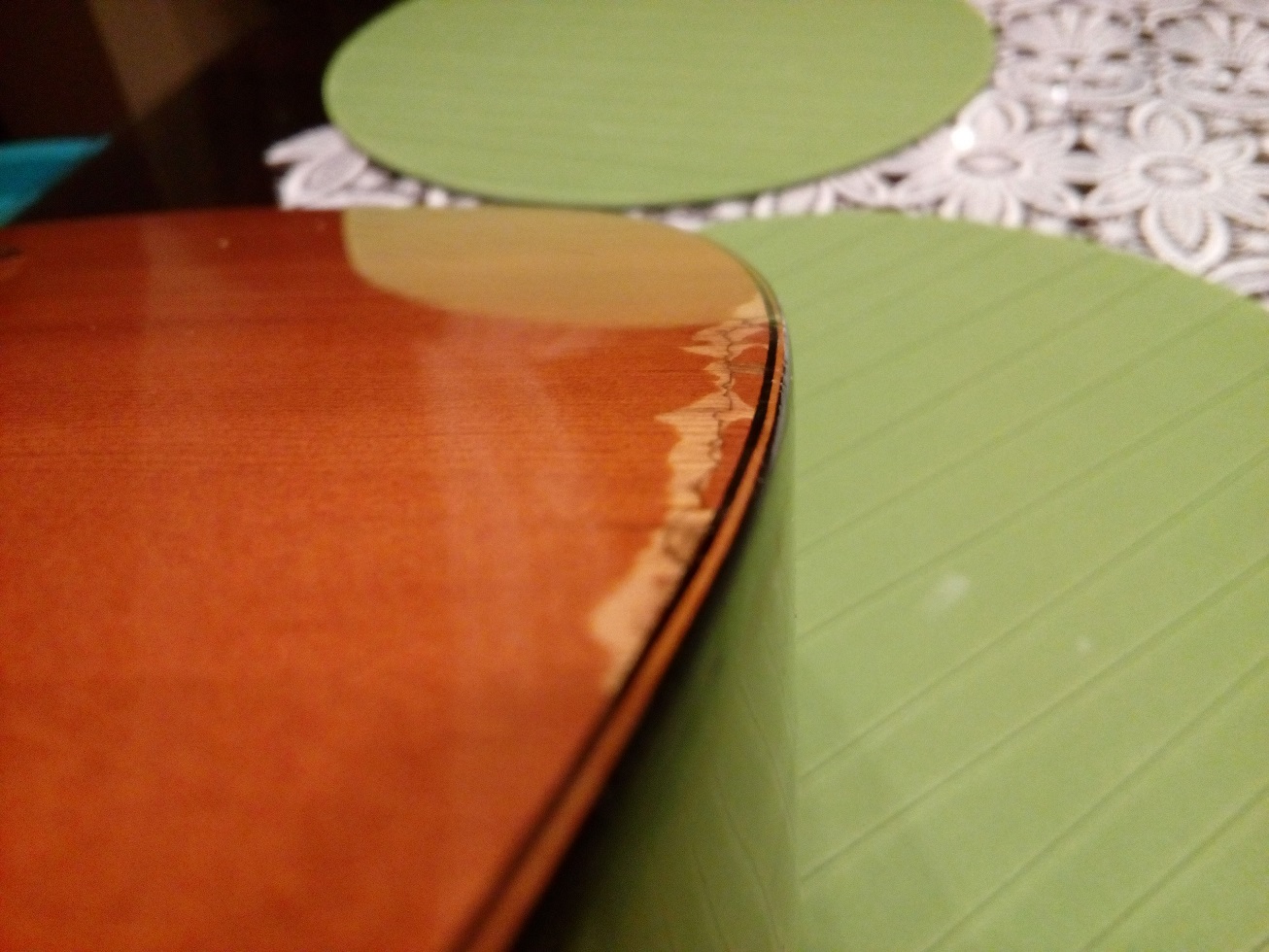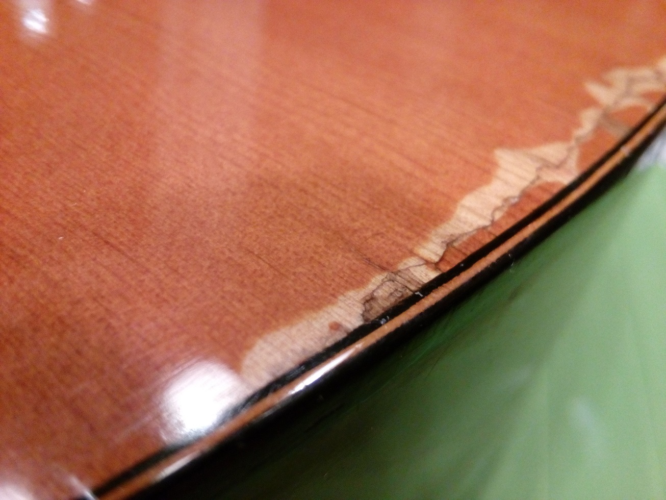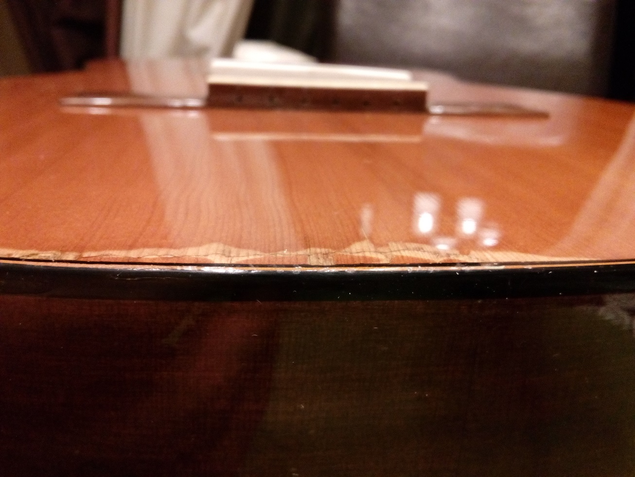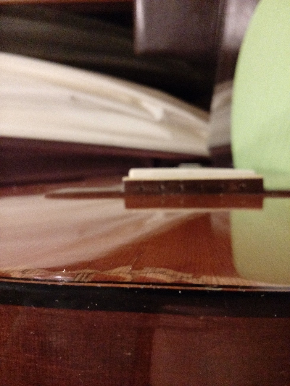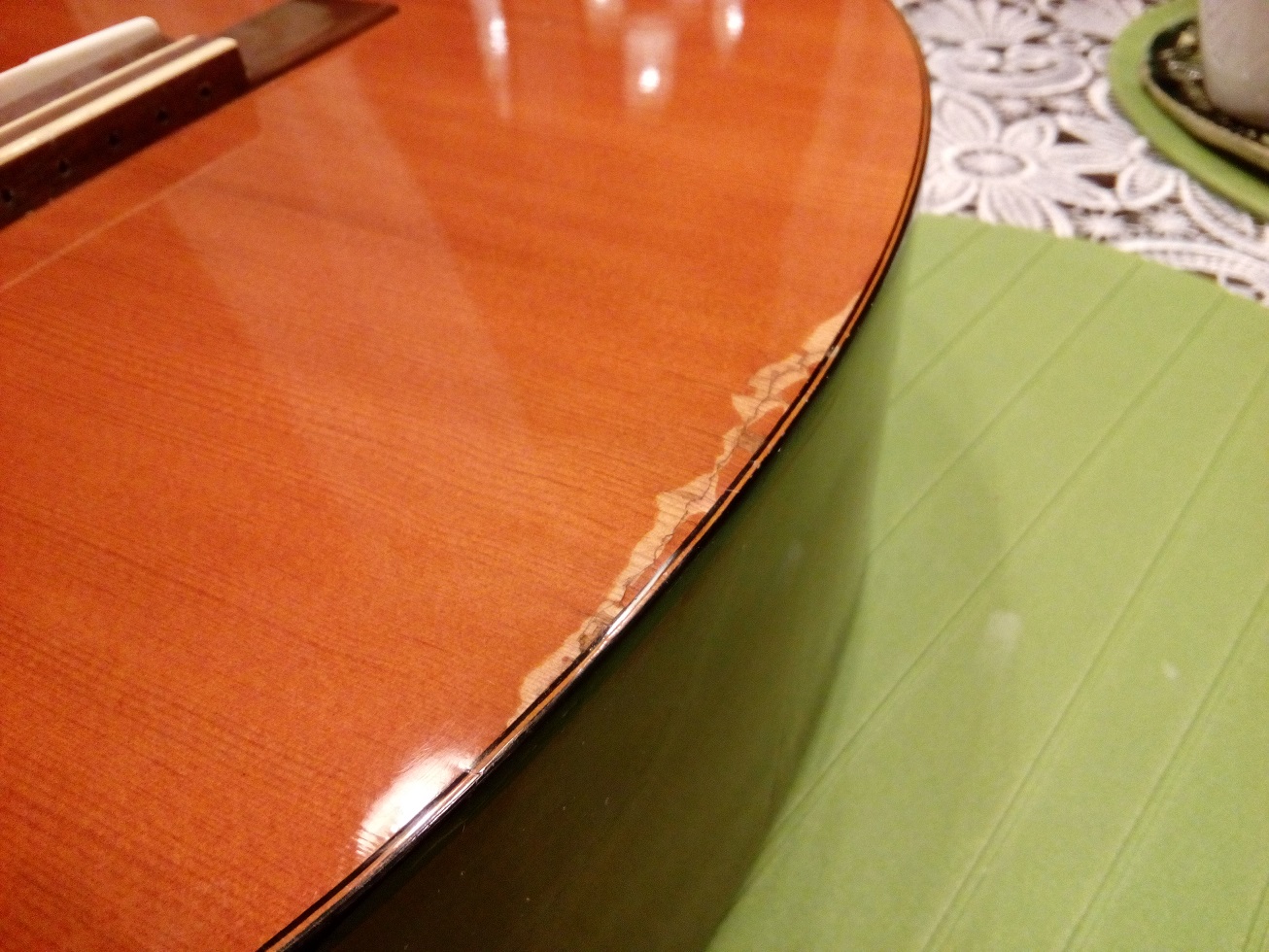 Proponowane przez PiotraCh przykrycie pęknięcia od spodu gryfu nie za bardzo się sprawdzi, gdyż musiało by objęębardzo duzy obszar w obrębie profilowania zakołczenia gryfu, gdzie taka kilku milimetrowa nakładka nie zdała by egzaminu.