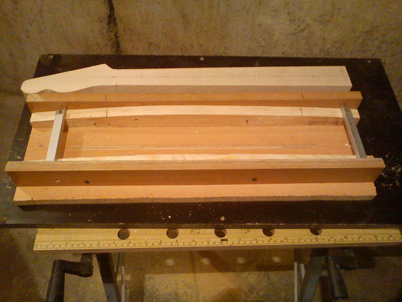 Na poczętek zrób sobie normalnie podstrunnicę pod to zwykły pojedynczy pręt.Jak skleisz tak jak radziłem to będzie wyględało jak gryf z jednego kawałka.Z tyłu możesz sobie wybraę kanał pod listewkę coby zachowaę pozory że pręt władowano od tyłu gryfu